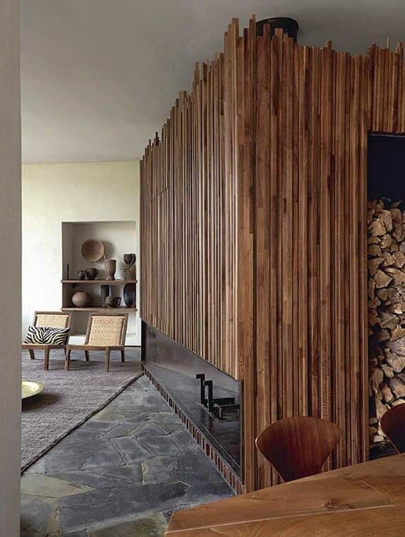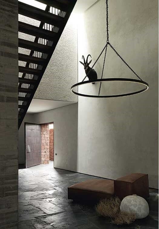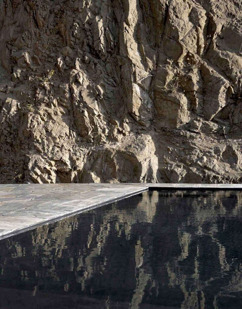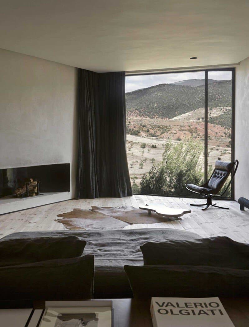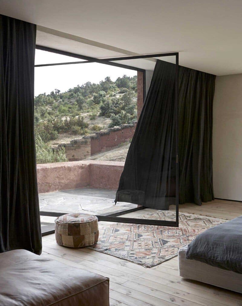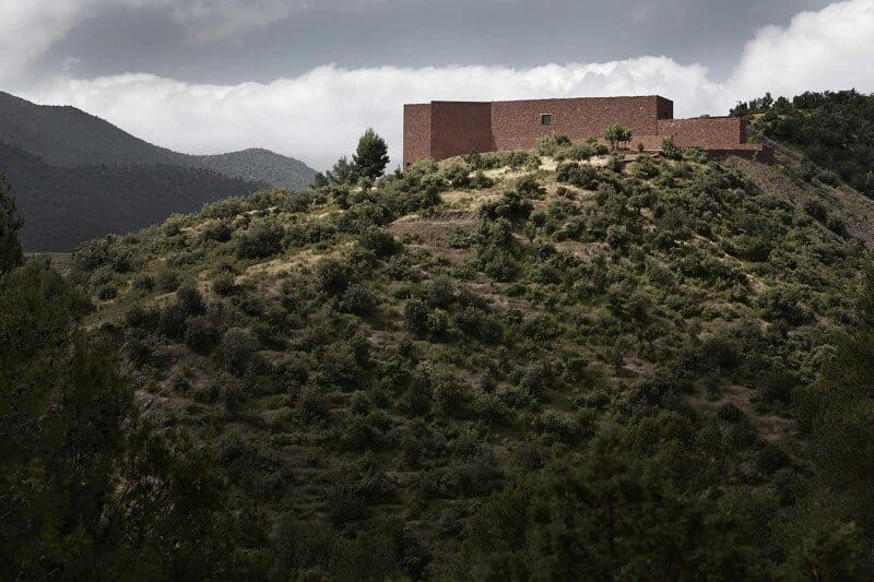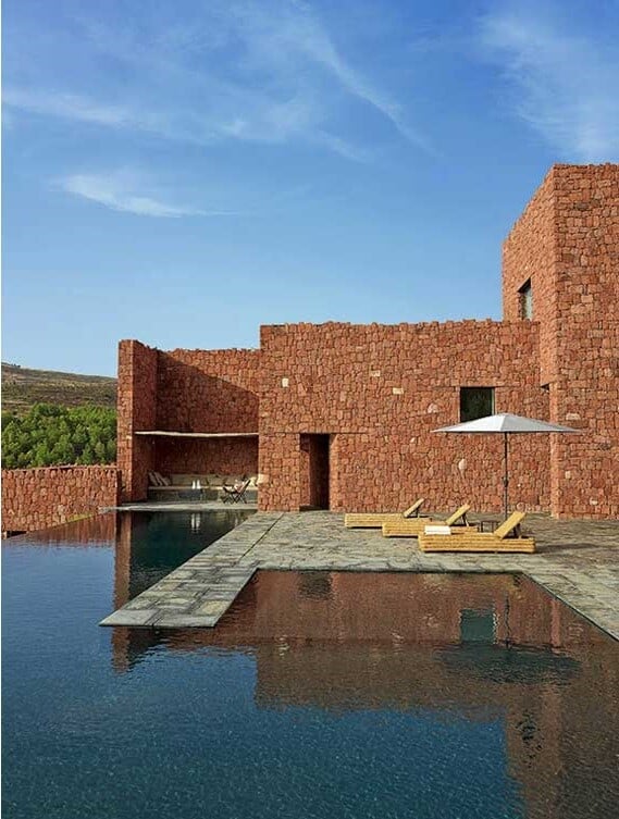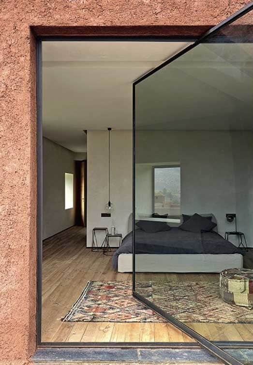 Studio KO designed this minimalist mountain lodge in the foothills of the Atlas Mountains in Morocco. Studio KO is formed of architects Karl Fournier and Olivier Marty. Locally-sourced Ouriko stone gives the Kasbah home the distinctive red color often associated with nearby Marrakech.