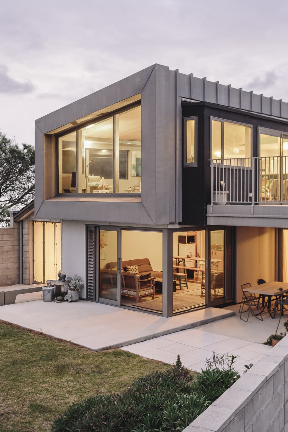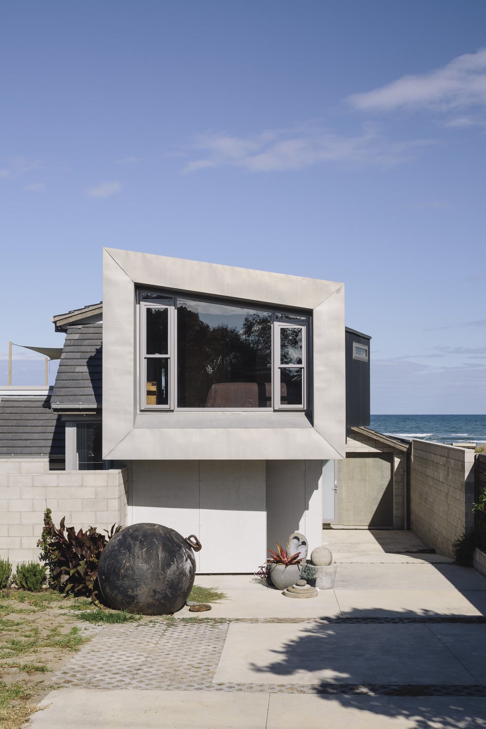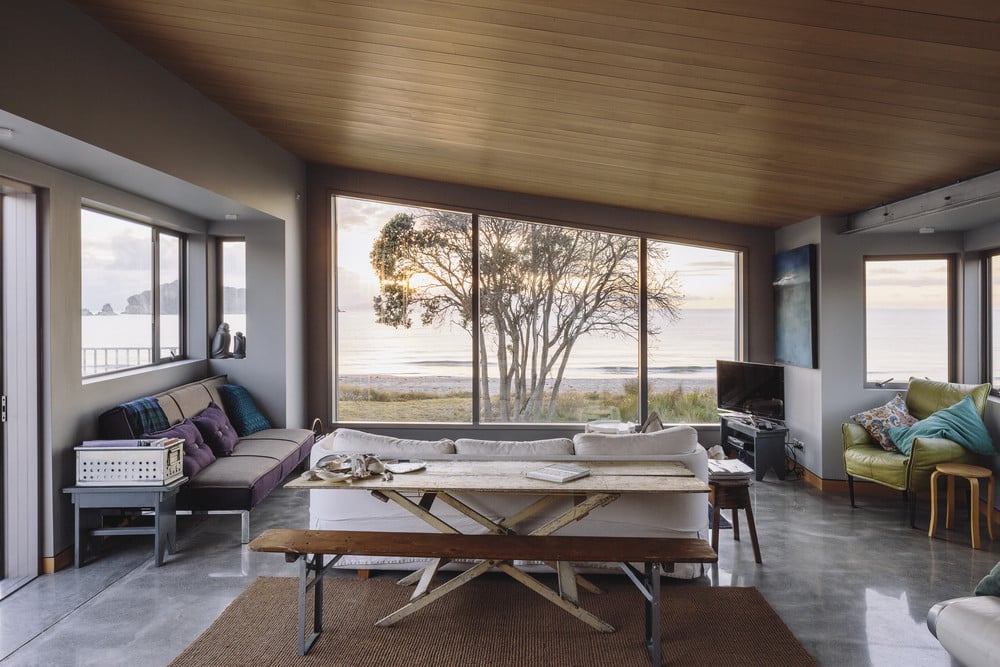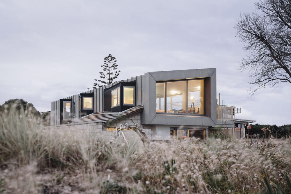 Description by Strata: This beach house faces due east, looking over the sand dunes of Whangamata in the Coromandel, towards the South Pacific Ocean. The exterior is primarily clad in a ribbed terne, chosen for its mottled and dappled finish as it ages. Care was taken to ensure that the ribbed terne extrusion gave a sense of floating atop the solid base. Internally, the concrete block forms the main tawa topped staircase. The ceiling is clad in tawa striations throughout the home, paired with the durable polished concrete floor. A rich and luxurious colour palette features in the bedrooms and living spaces.