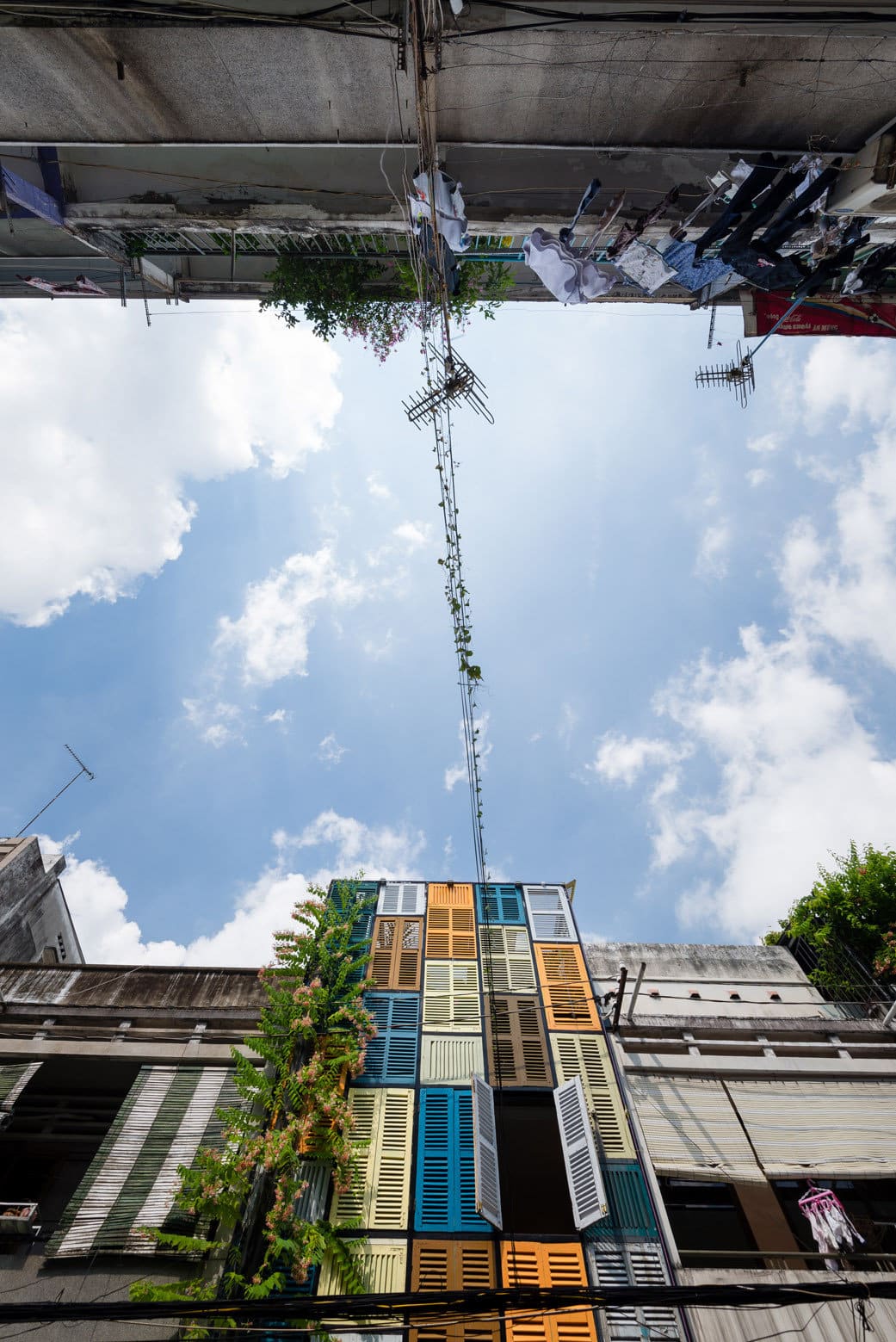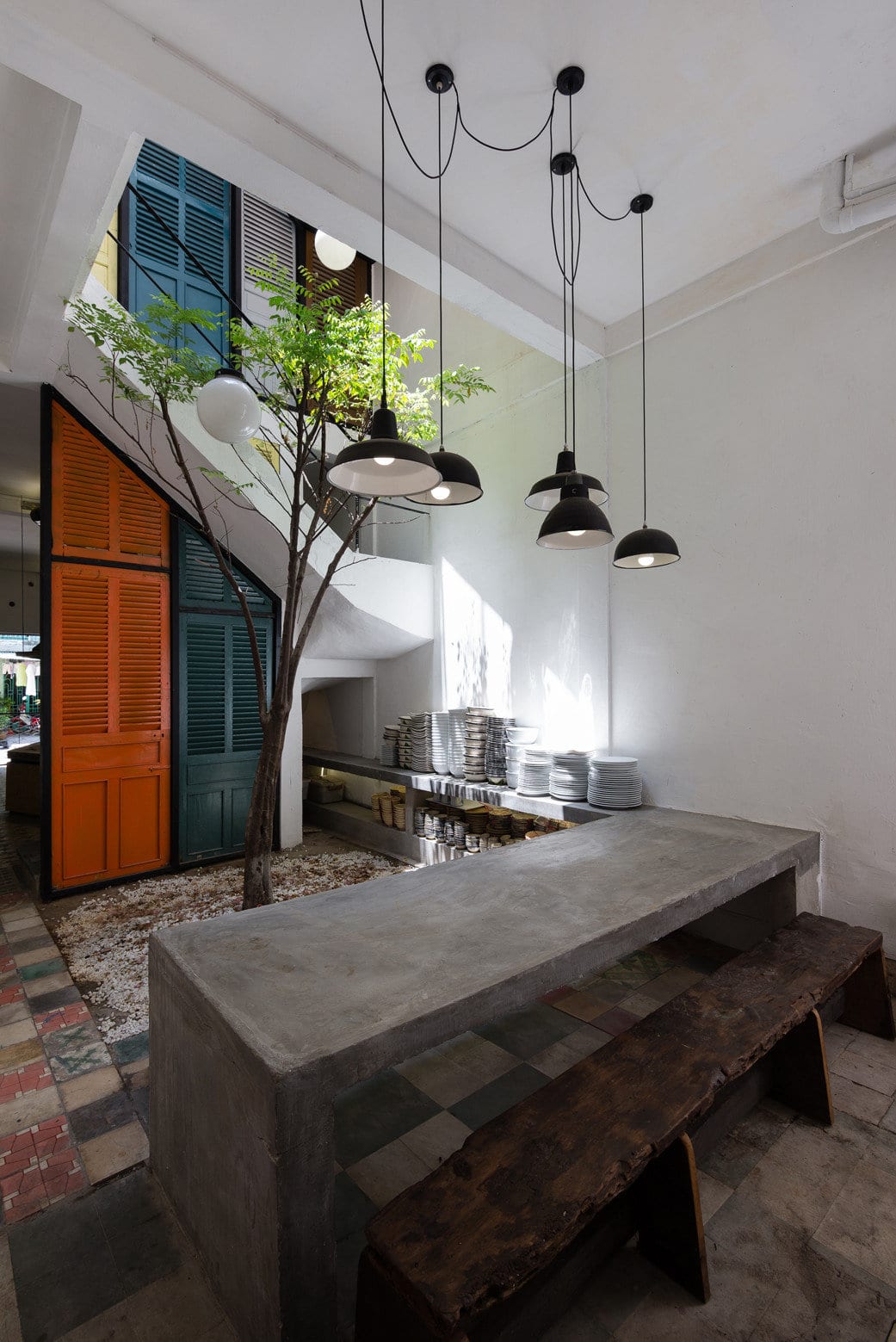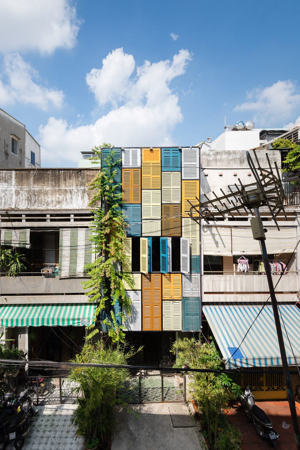 The old windows were used as the main material to create a distinctive appearance. These windows have been used in Vietnam for a long time because of its ventilation. They are now rearranged into a new facade with different colors and cover the old facade, wrap it up to the rooftop and create a special attraction, as well as harmonizing with the ancientness of entire area. Some open windows on the roof provide the trees beneath with space and natural light. This symbolizes growth, hopes for the future and goodness from traditional bedrock.