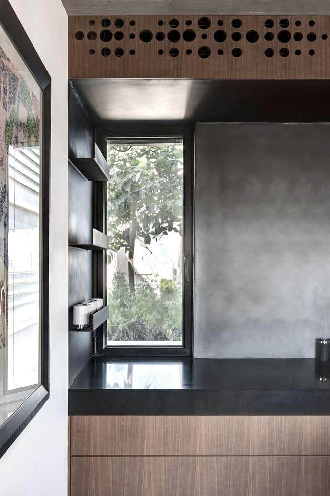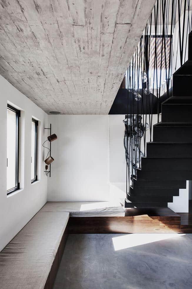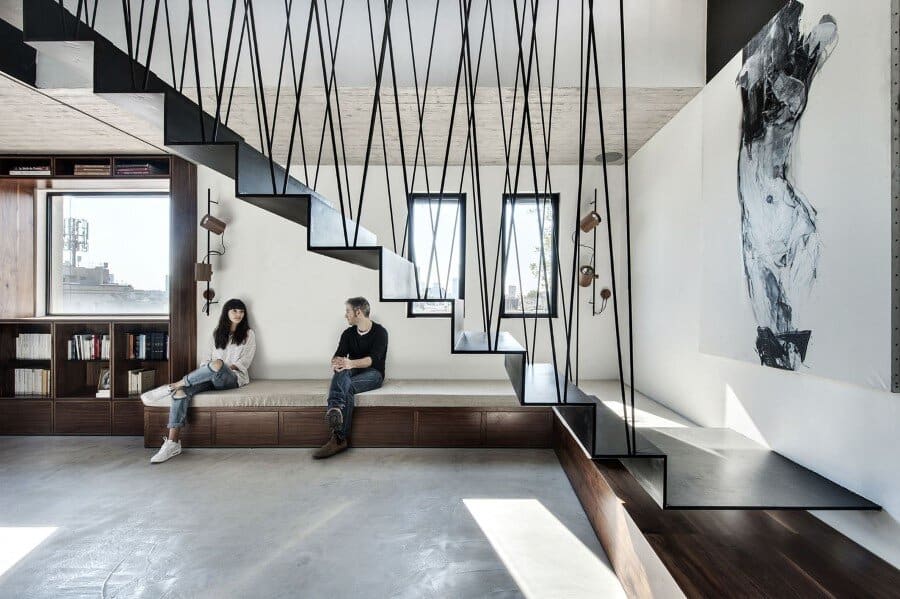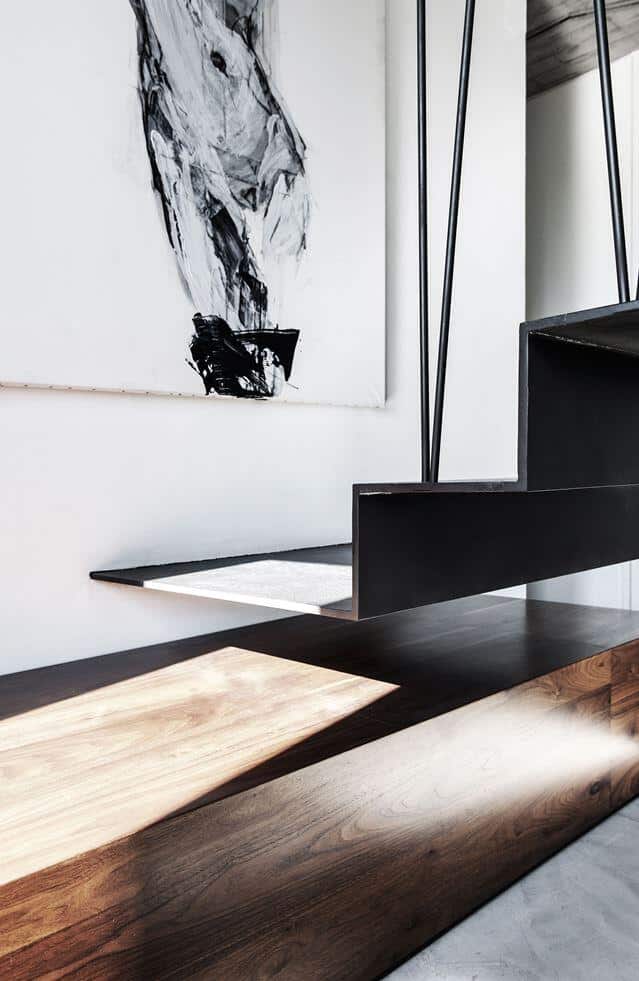 The use of wood, concrete and black metal was chosen in order to create a contemporary yet warm space. The hanging metal stairs articulate all the space creating graphic linear shadows thanks to the strong and changing natural light and to the crossed metal strings. They are composed like a painting in the center of the space and allow views between all the open areas.