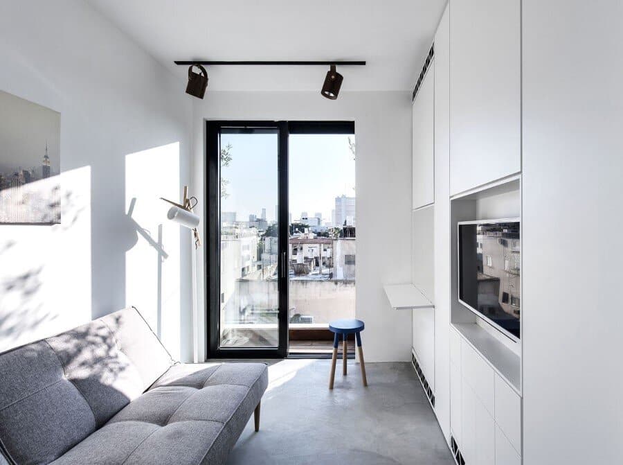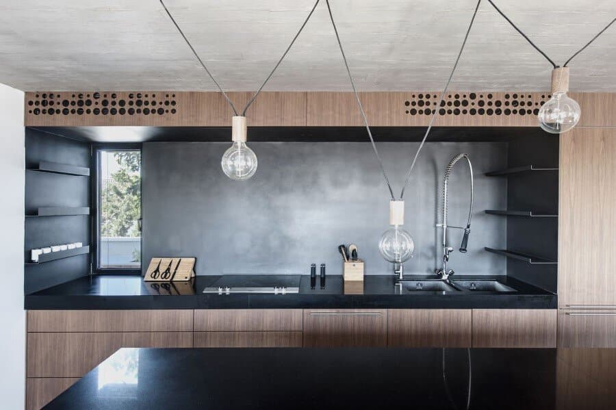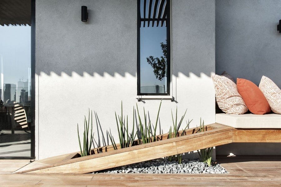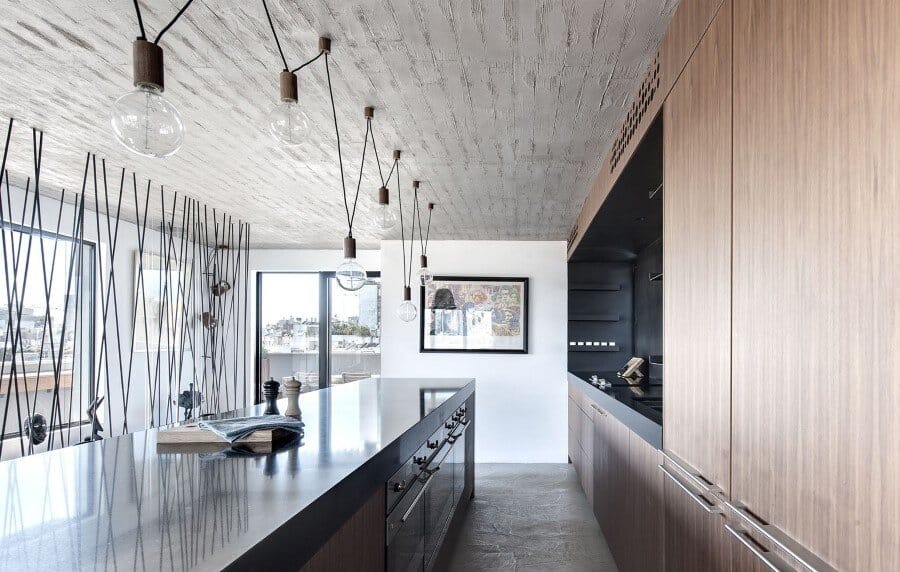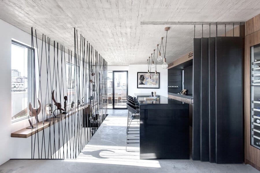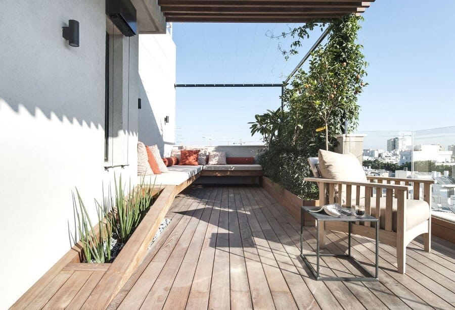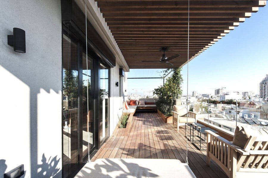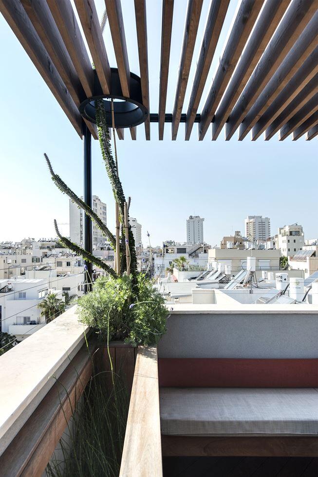 The exterior was designed as the extension of the interior with a big wood pergola all over it and lots of plants, since in Tel aviv, the weather allows to use it more than 9-10 months a year. The wide wood pergola creates a frame to the skyline of Tel Aviv and the glass handrails integrate the view as part of the apartment . The idea is to erase boundaries. The inside becomes closer to the outside and the outside penetrates the inside space.
