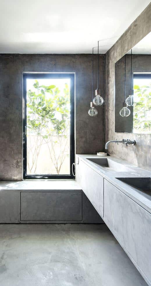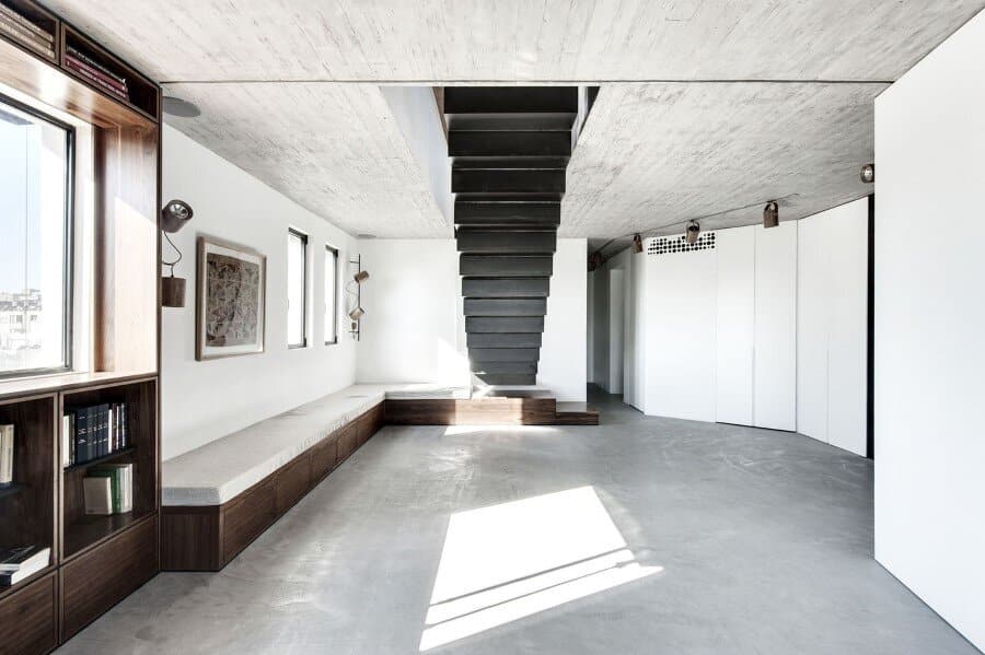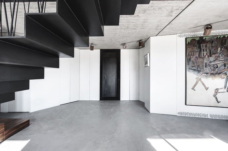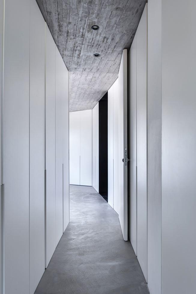 On the other hand, the parents have their master suite, with a completely different architectural language, separated from the rest of the duplex and that includes a minimal and immaculate white walk-in closet, a fully beton covered bathroom and a master bedroom.