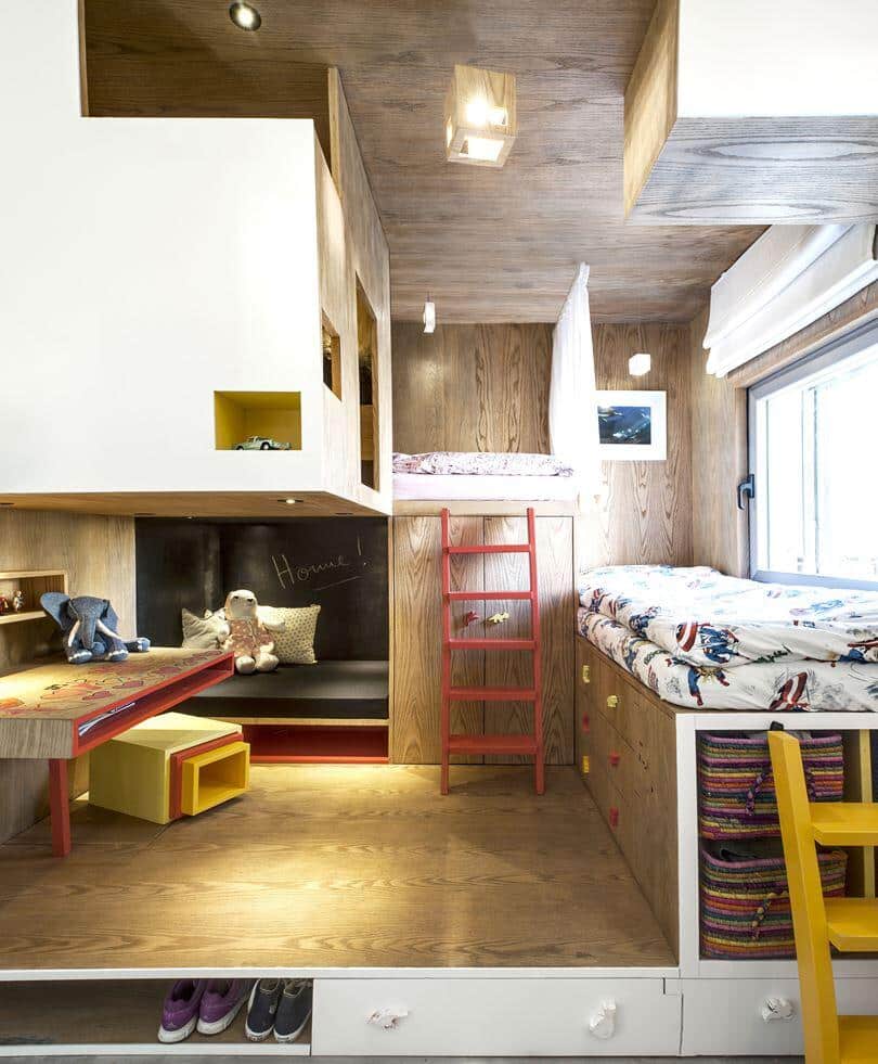The clients, a family with children, wanted a chic and playful place at the same time. As a result, the kids room was designed like a playground, integrating a desk, a blackboard, book shelves, beds, a wood cabin with laser cut maps on the wall, a dance bar, closets and so on in order to encourage creativity. They have their own wood and color house inside the family house.
