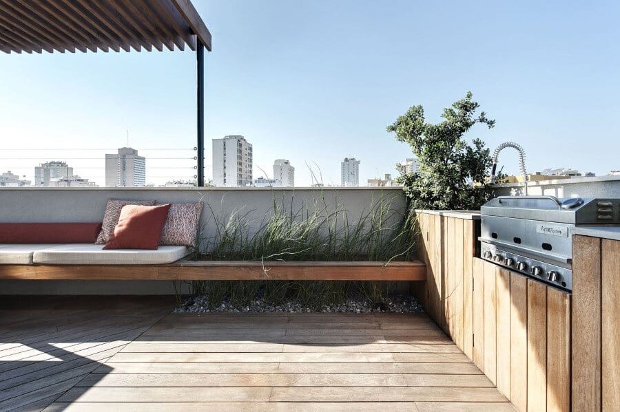 Teak wood was used to create lines that never end, changing direction and going up and down to become benches, plant containers, an outdoor kitchen, a swing or a bar.