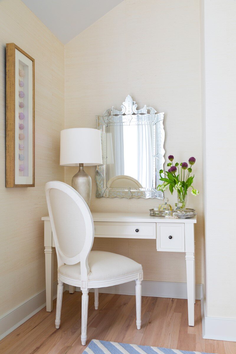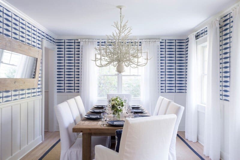 A serene and natural foundation of shimmering grasscloth wallpaper, bleached hardwood floors and wide loom sisal rugs were wrapped around the walls and floors like a sandy floor surrounded by dunes. Layer upon layer of white sheer fabrics filter the sunlight like an umbrella and pick up on the faintest of breezes, as a sail would. The repeated use of bold patterns in shades of blue, sand and white, a surfboard in the stairwell, a downright daring selection of wallpapers and a dreamy master bedroom transform what was a homely home into a buoyant and sparkling oasis, an idyllically peaceful and decidedly playful getaway whose undertone reads.