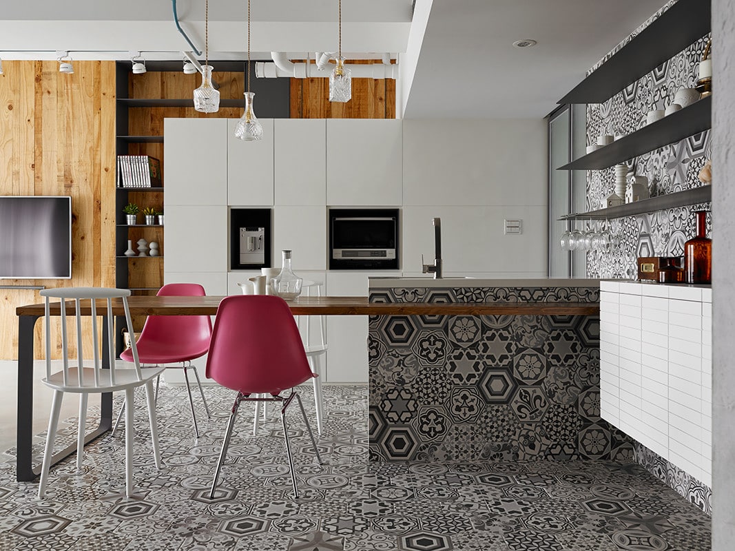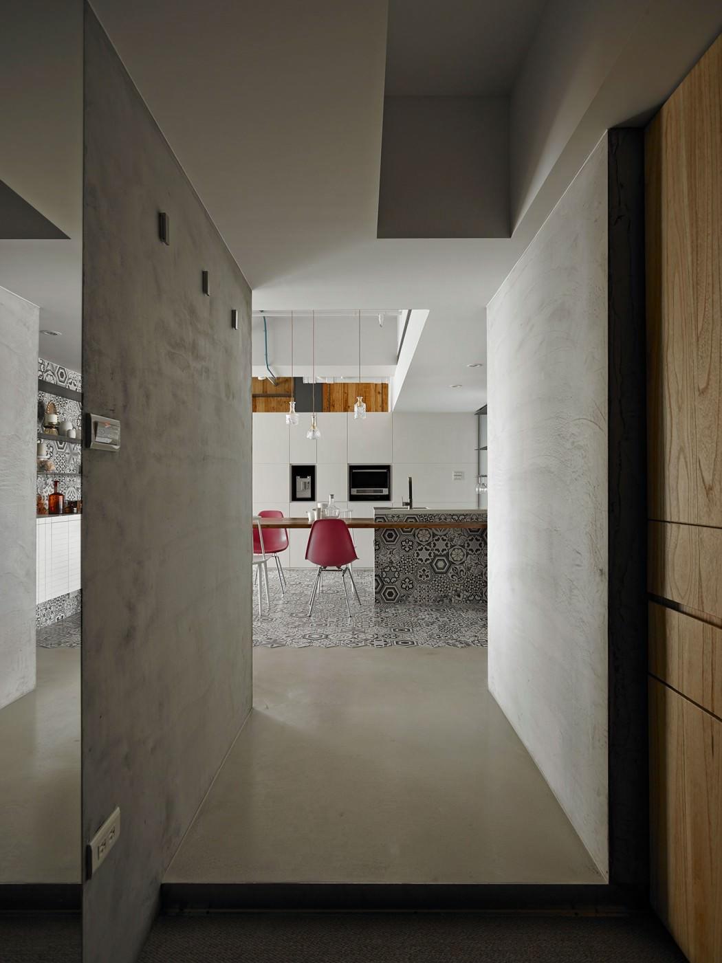 Hu Residence is a small apartment with eclectic interiors, beautiful personalized with hexagonal tiles. Designed by KC Design Studio, this apartment has an area of 20 sqm and is located in Taipei, Taiwan.