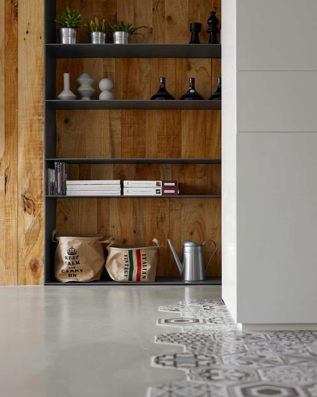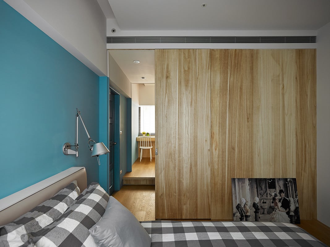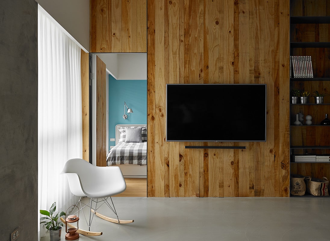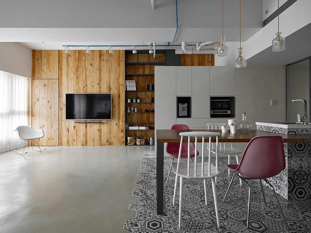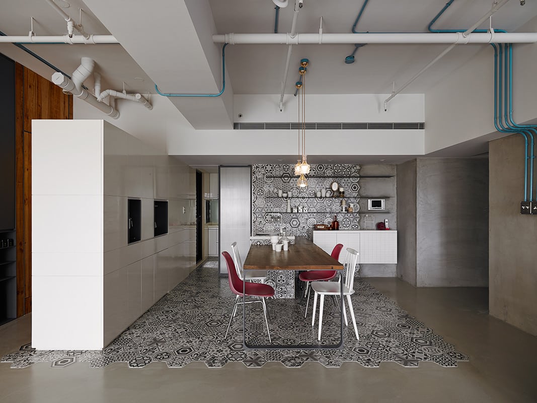 The area in hexagonal tiles extends from the kitchen floor to the dining room and the bar and side walls. The dining area is vividly defined. The iron boards are embedded into the tile wall for storage and display without affecting the original texture.The tall cabinet with baked paint no higher than the girder is used as buffing area for the entrance of the private space. With the cedar walls to the top and the hexagonal tiles in the front, it presents contrasts in texture and different levels of fun in space.