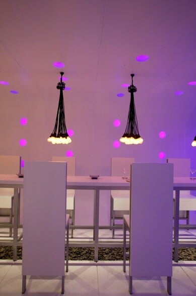 The space is filled with a longitudinal bar and at the lateral pavilion you can find the huge frames with the Peruvian contemporary art-work.