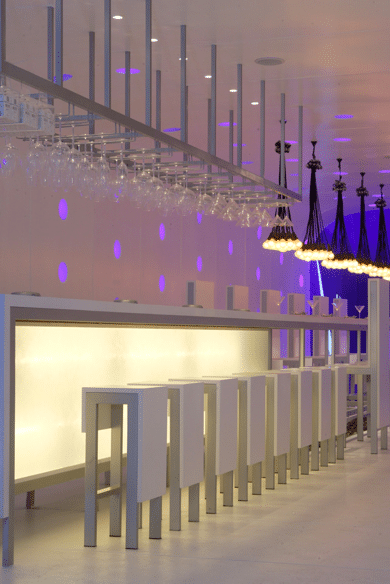 The project is situated on the second level of the palace using two rooms, like containers, one for the bar and one for the art gallery. The connection between them is made by a tube. Then the tube was drilled from the middle part of its walls and middle of its ceiling. And from this holes crested like this you can see emerging the blue-violet light who comes into the space like an eerie; giving you the feeling that it floats inside of the building. Separated from the floor, the ceiling and the walls was introduced a pavilion of curve borders and when you enter you are outside of the building.