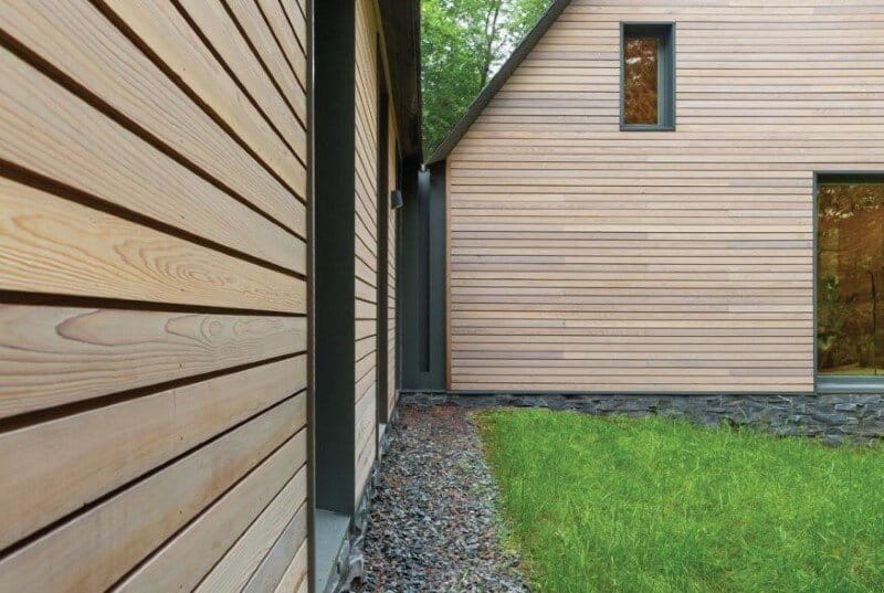 Bypassing traditional white clapboard, the cottages are clad in red cedar planks to blend into the woodlands. Gabled roofs sheathed in Vermont slate soar skyward as indigenous fieldstone bases anchor the cottages to the land. Inside, large operable windows frame views of the forest and fill each room with daylight. Locally sourced white pine walls and ceilings and Vermont slate floors compose a simple yet durable palette of natural materials, reinforcing an interconnection between music and landscape, exterior and interior.