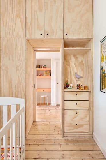 The full-height joinery includes plenty of storage spaces that can be accessed both from the outside and inside of the bedroom. A kind of mezzanine space provides extra room for storage and storing.
