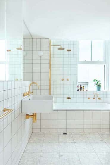 The bathroom is decorated with common white floor tile and faience, but mounted in a creative way. The taps and all the metal accessories are galvanized with gold color and they give a very chic note to the entire bathroom. The entire apartment, dominated by wood, white, and natural light is a warm home, a bringer of peace and relaxation.