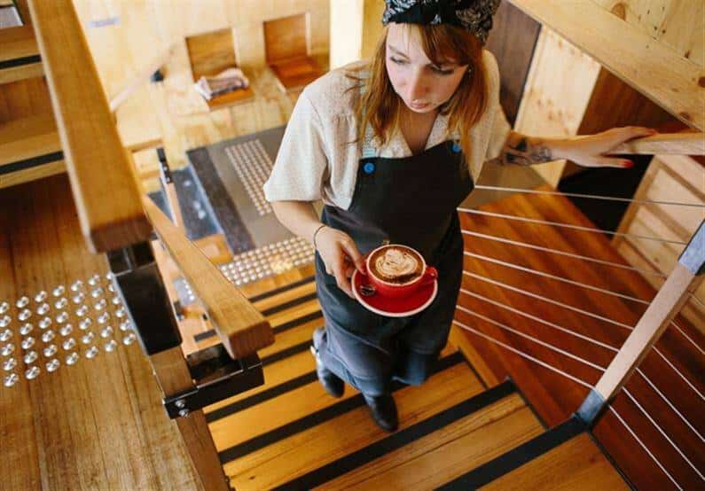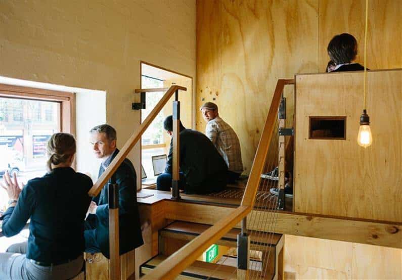 Heide and Evans chose to use wood widely, material that helps to achieve a warm and comfortable place. Flipboard Cafe is one of the few places that interrupt the pedestrian traffic on La Trobe Street in Melbourne, but you have to be lucky enough to find free space in the niches from the facade.