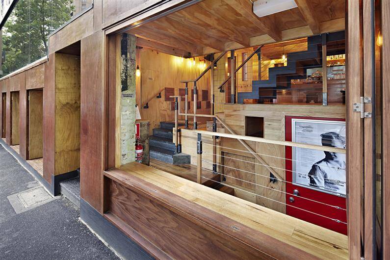 The space is located behind Brolly Studios, where the two designers operate and it is flanked by the emergency exit of the Bennetts Lane Jazz Institute. The reduced width of the space has imposed a vertical organization of the café, having as the central axis a staircase that plays an important role in the dynamic of the location.
