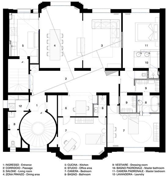 All the different project features (on their own different scales) tend to create premises which are, at the same time, architecture and interior space, capable of reflecting and bringing together the most rational and emotional aspects of the home-dwellers in a very cutting-edge language that highlights rather than conceals the original character of the property.