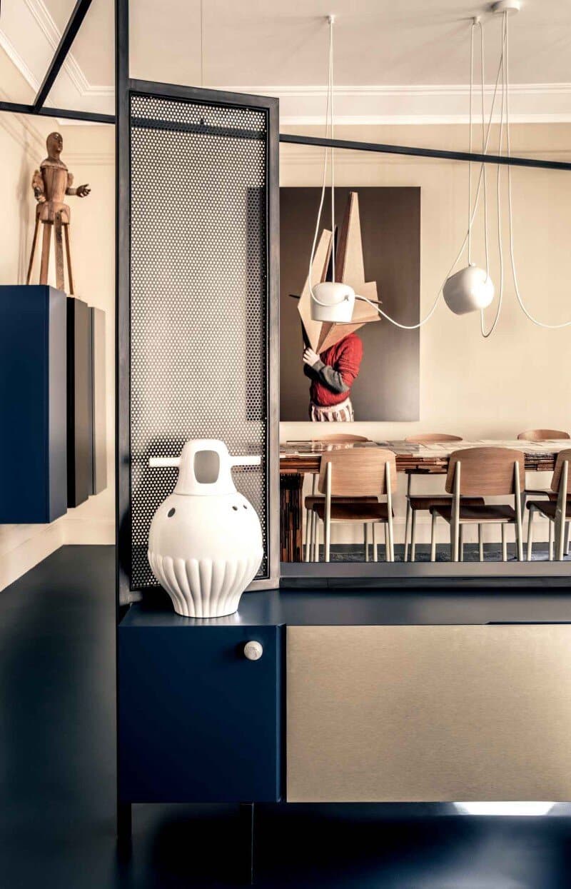 Apart from minor alterations to the walls, the project was based on a rack system made of metal sections and perforated sheet metal, which, due to the way the materials are used architecturally, paid tribute to the work of the French designer, Mathiew Matégot, a real forerunner in experimentation aimed it combined together these two materials. According to the design envisaged by Andrea Marcante and Adelaide Testa, the metal tubes set freely in space stand alongside decorative features characteristic of French homes, such as wall stuccos and cornices, setting new visual lines and also new perforated metal structures, designed for seeing but not for being seen, separating transition zones from rest areas (lounge and study area) and capable of being converted into props for new furniture.