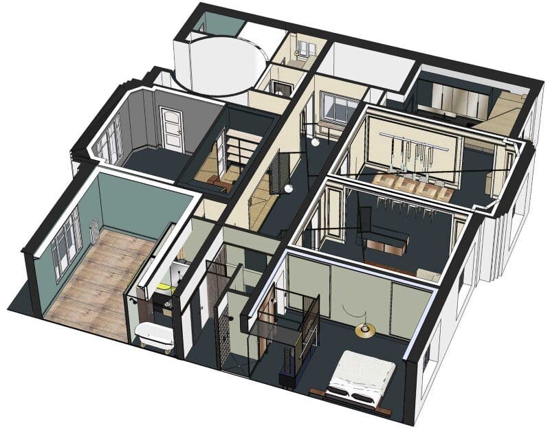 The client’s specifications were clear and precise: the apartment needed re-functionalizing, while minimising the number of walling structures, completing the work as quickly as possible (maximum of three months, so that the family would not be inconvenienced too long by moving to a different home) and rethinking the communal areas, such as the kitchen and study, and also the more intimate bedrooms/bathrooms, so that every member of the household could have their own separate premises.