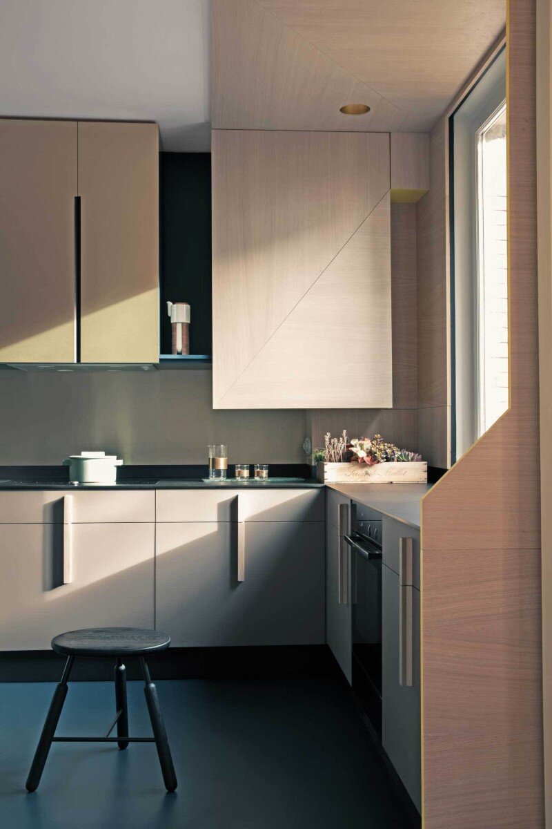 The new axial coordinates set by the square-sectioned tubes starting in the corridor are rotated in relation to the layout of the plan and, like extendable suspended arms, reach out to the lounge walls as if to underpin them through an exchange of tensions: a vision of modernity that cannot ignore the past and actually wants to “support” it through interaction between subtle and sometimes ambiguous balances, where architecture can become decoration and vice-versa. Hence the master bathroom becomes perforated micro-architecture re-functionalising the bedroom without altering its structure or inflowing natural light; the study area shared with the children is reconfigured into a stage full of forms and materials poised between the kind of irony associated with adults and fun characteristic of children. The new custom-designed kitchen dilates the space and, by means of stereometric patterns across the ceiling, reinstates visual interaction with the condominium garden below.