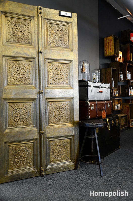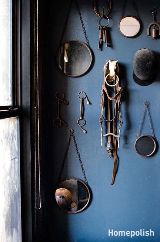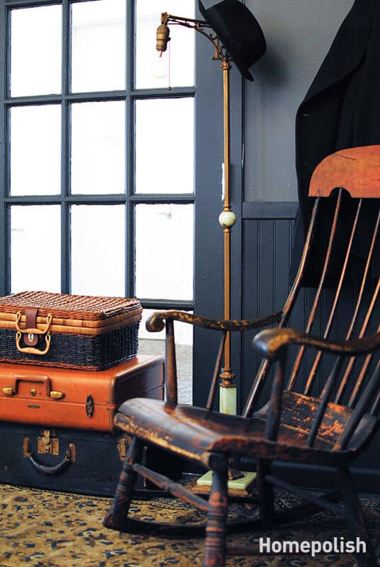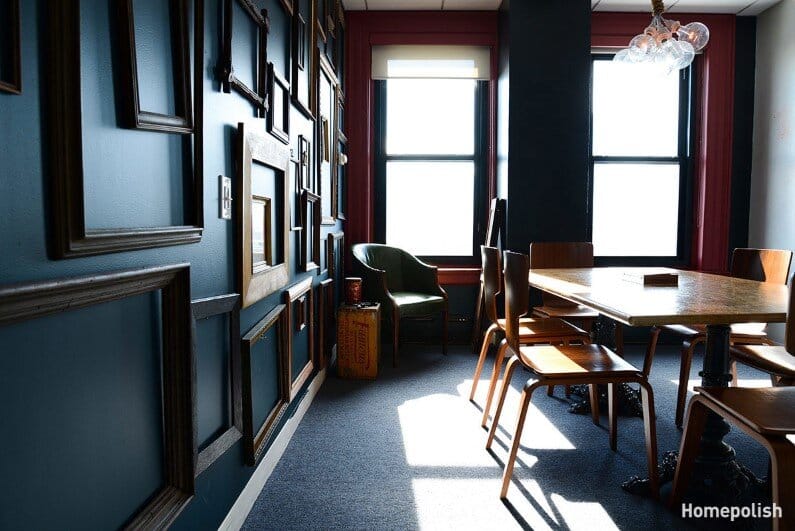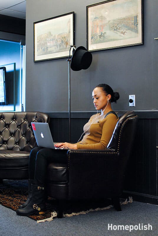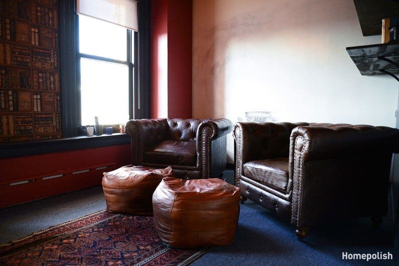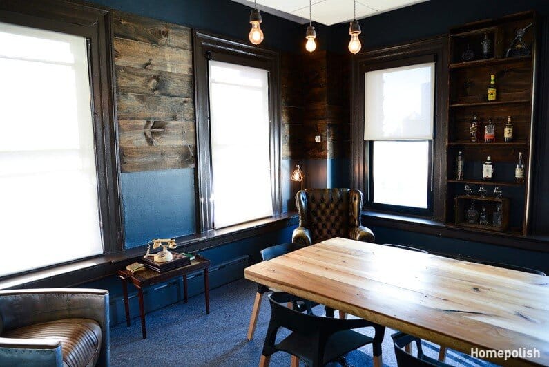 Based on this idea, designer Danielle Arps from Homepolish with help from Payton Swenson and Homepolish cofounder Noa Santos has insisted on the comfortable leather furniture, on the usage of wood with dark colors from the earthy color range and on subdued wall colors. Also, the designers have included chalk drawings on the wall, shelves made of crates and also lots of exposed light bulbs. All these are designed to keep the space feeling comfortable and cozy. Photographs by Claire Esparros.