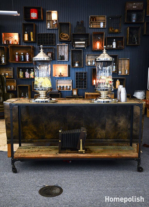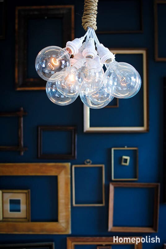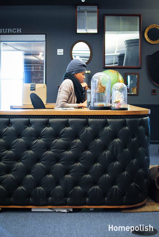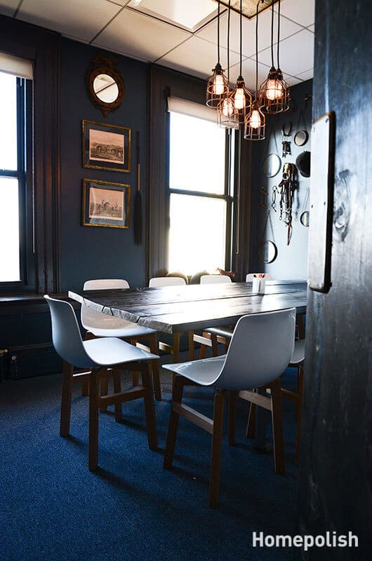 Based on this idea, designer Danielle Arps from Homepolish with help from Payton Swenson and Homepolish cofounder Noa Santos has insisted on the comfortable leather furniture, on the usage of wood with dark colors from the earthy color range and on subdued wall colors. Also, the designers have included chalk drawings on the wall, shelves made of crates and also lots of exposed light bulbs. All these are designed to keep the space feeling comfortable and cozy. Photographs by Claire Esparros.
