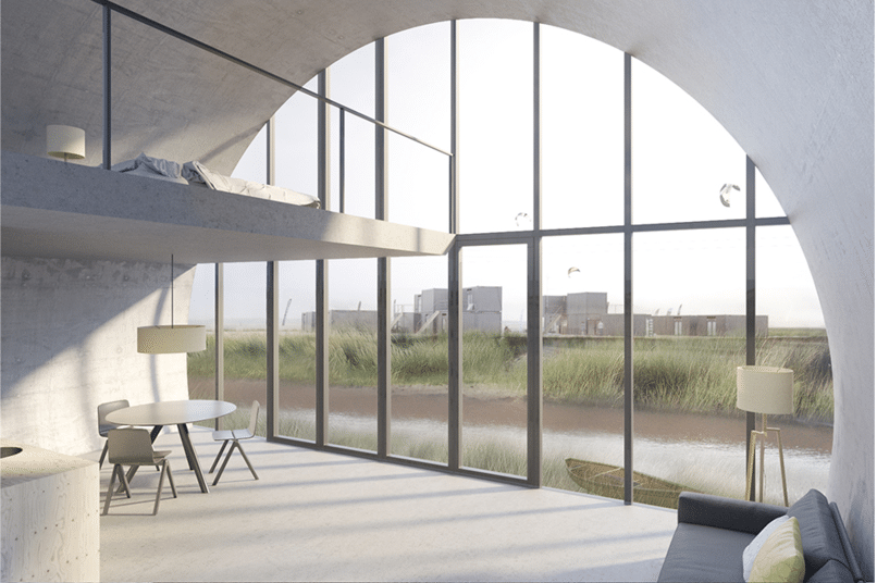 The closed sides of the buildings, however, maintain privacy among neighbours. Internal space and natural light are maximised by the expanding cylindrical volume of each house. All of the required conveniences for an exclusive modern lifestyle are provided in the eye catching rolling homes, which combined with their stunning natural location create a desirable place to live. Visit DO Architects