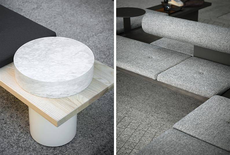 Galleria is a piece of furniture with a conception and an interesting design, made by Pearson Lloyd. On a steel bar, as a vertebral column of the entire assemble, there are added wooden plates, blocks of upholstered  fabric or leather and solid marble discs. The result is a logical composition as assembly  but rather abstract through the used textures and materials.