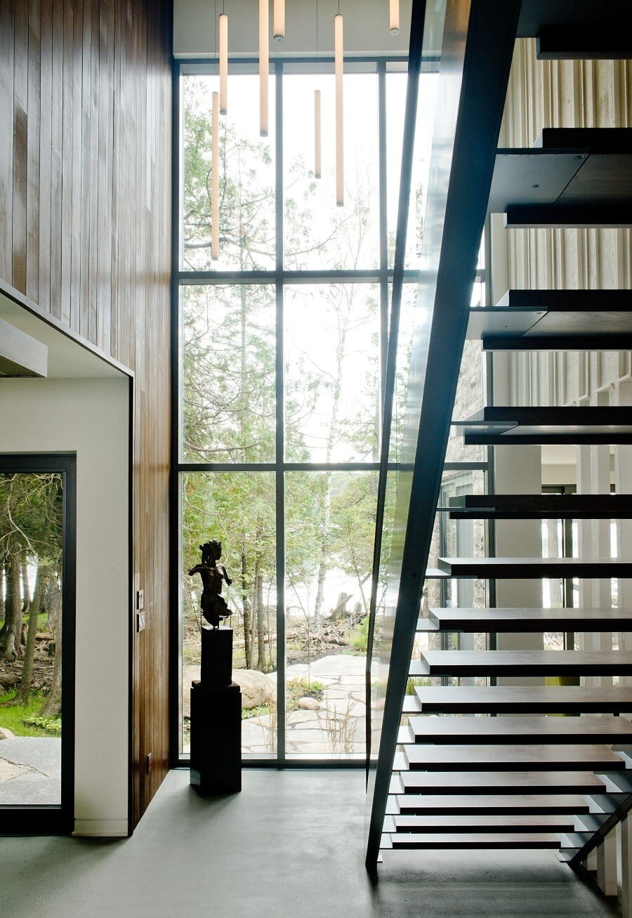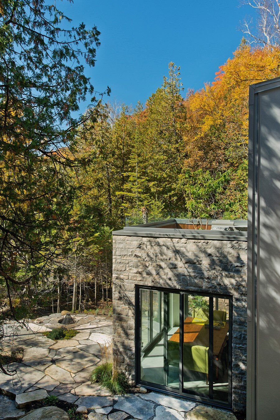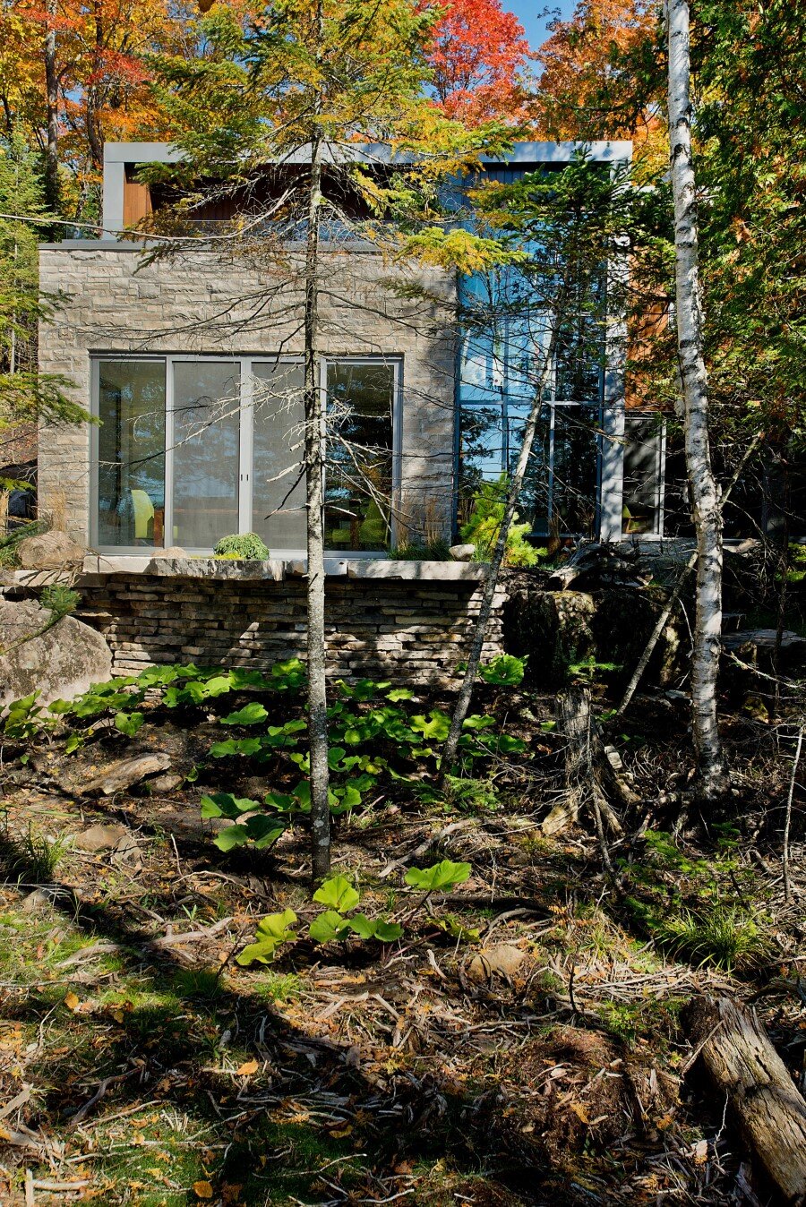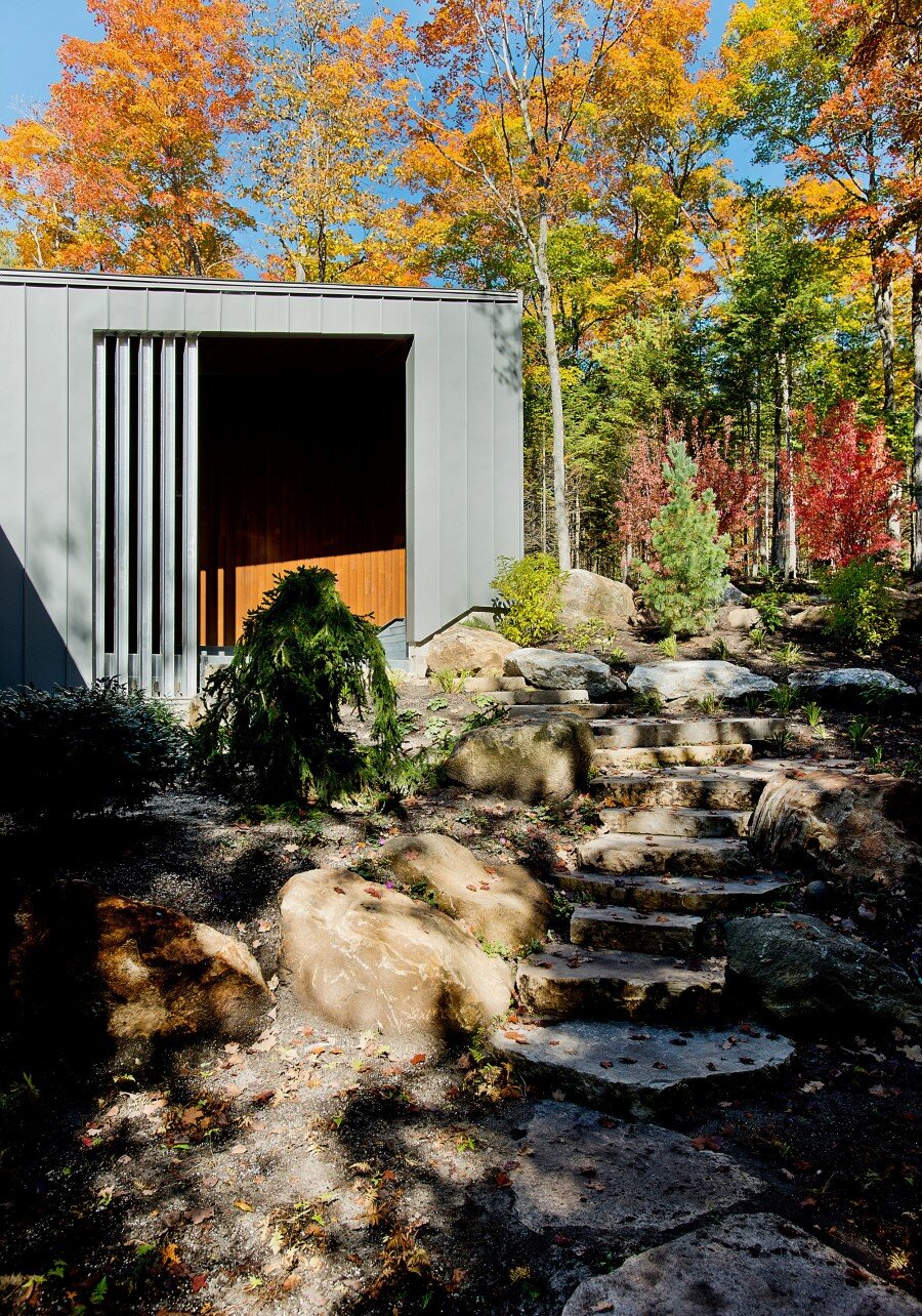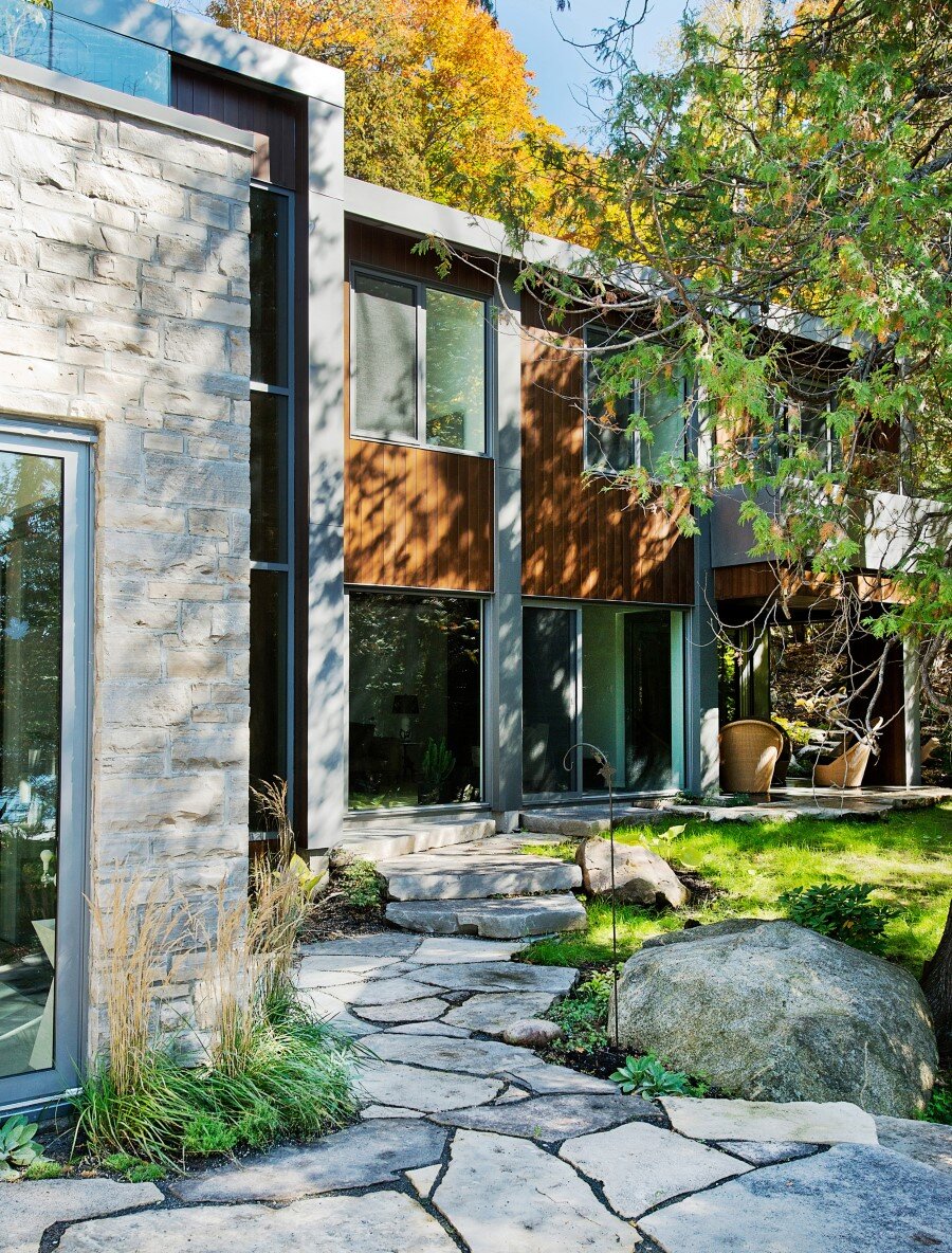 Description by Boom Town: Located on the shore of the Gate Lake, on a slightly sloping land of almost 80 000 pi2, the chalet takes place on the edge of a cedar wood with majestic mature incline trunk trees. Although the footprint of this two-storey building is substantial, because the roof slope follows the landscape the impact of it site integration is minimal.