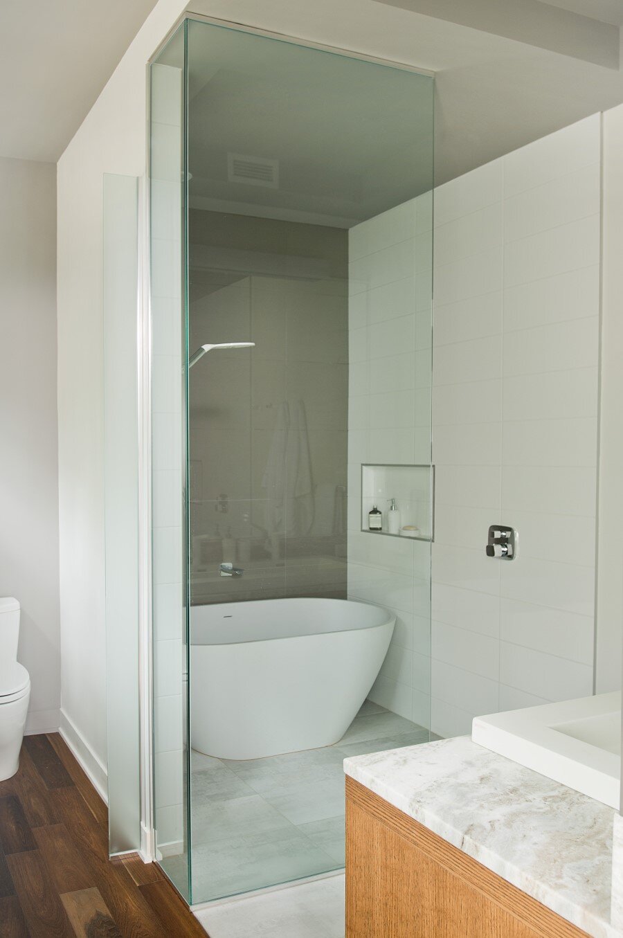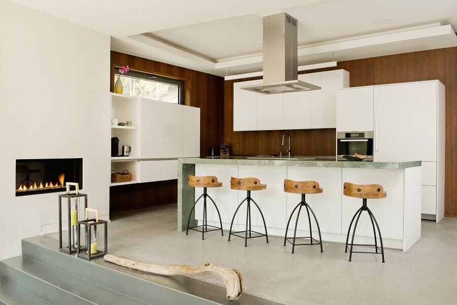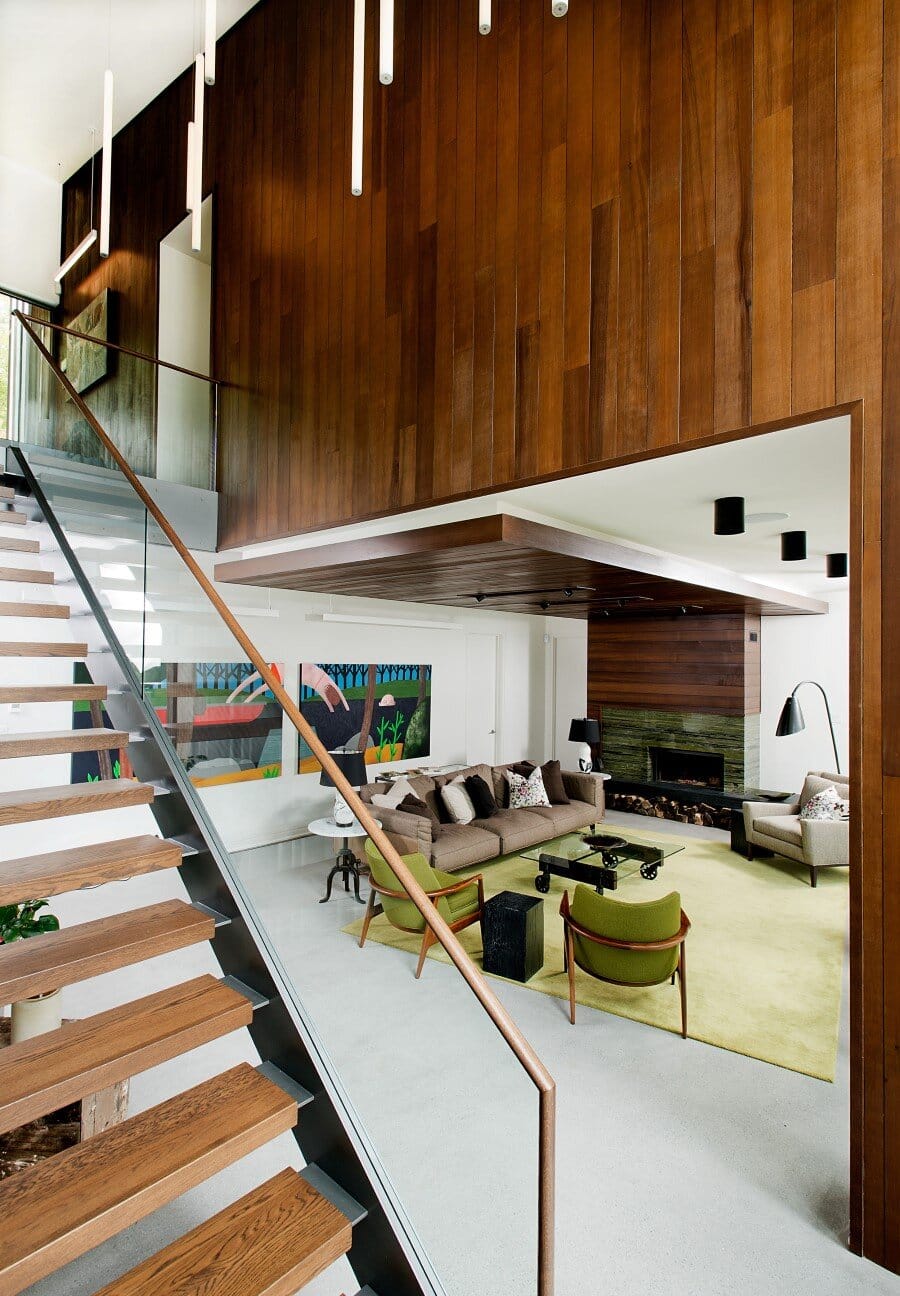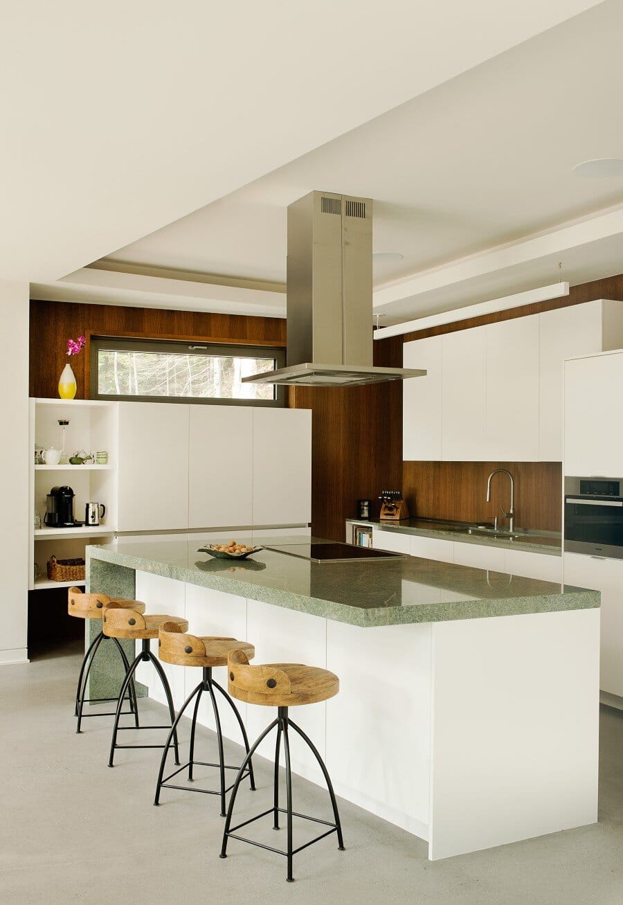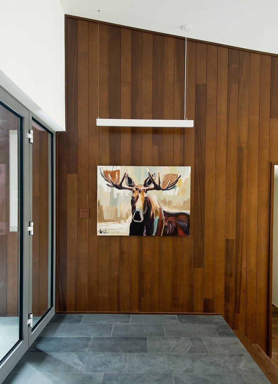 Description by Boom Town: Located on the shore of the Gate Lake, on a slightly sloping land of almost 80 000 pi2, the chalet takes place on the edge of a cedar wood with majestic mature incline trunk trees. Although the footprint of this two-storey building is substantial, because the roof slope follows the landscape the impact of it site integration is minimal.