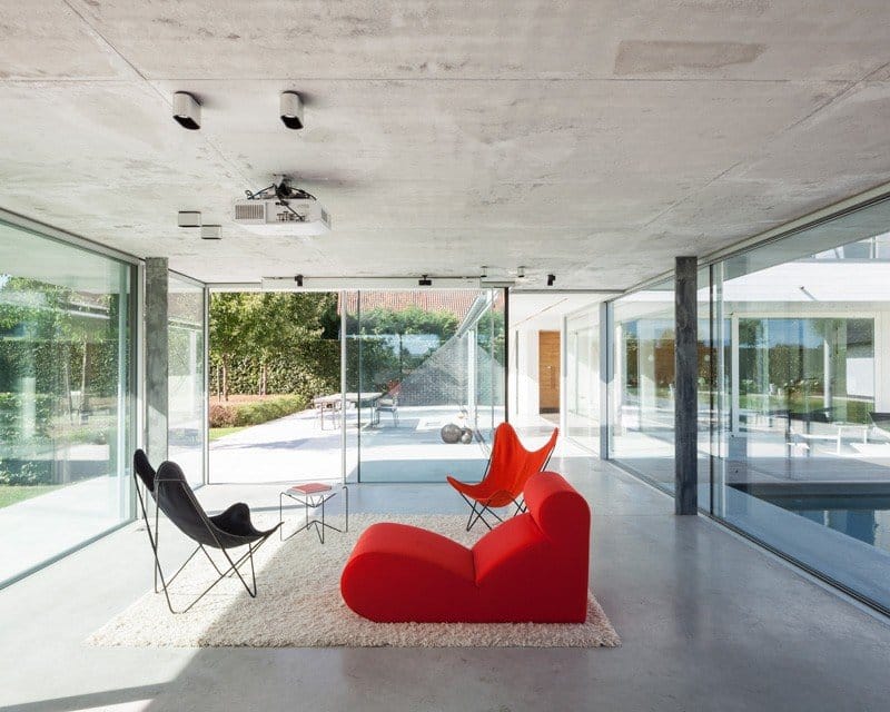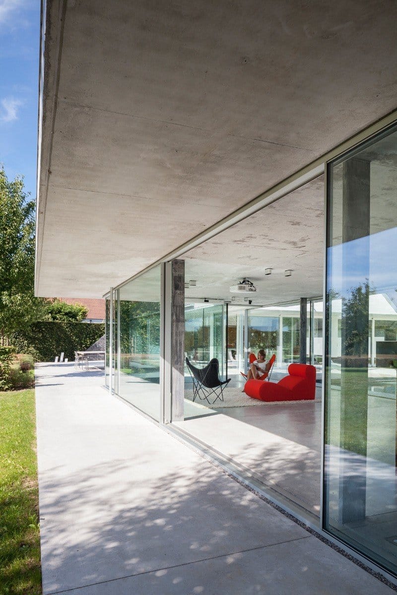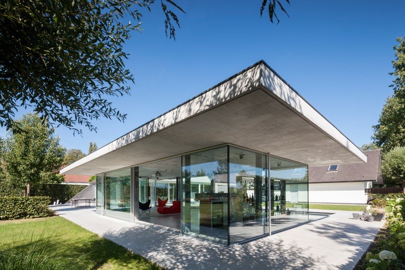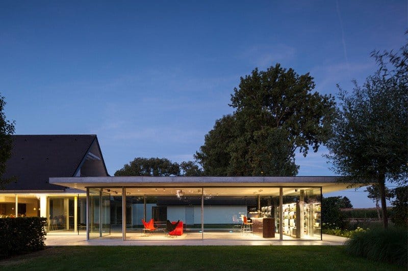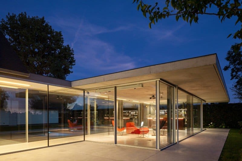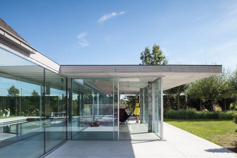 Lieven Dejaeghere architect has designed a concrete and glass pool house, a pavilion connected to a rural residence.