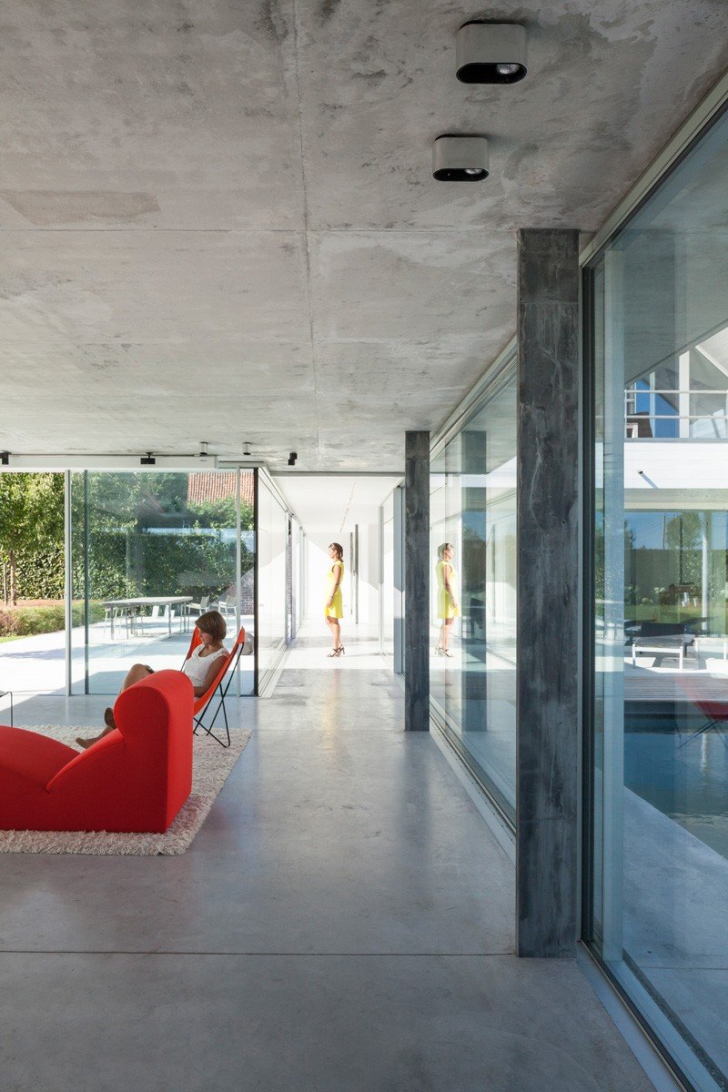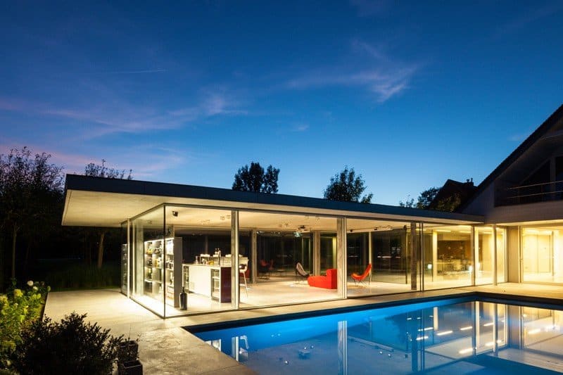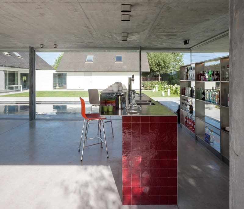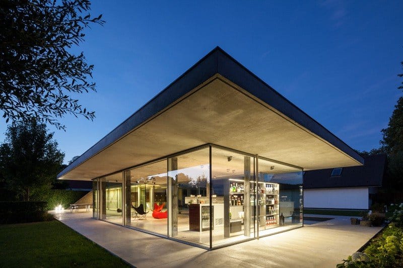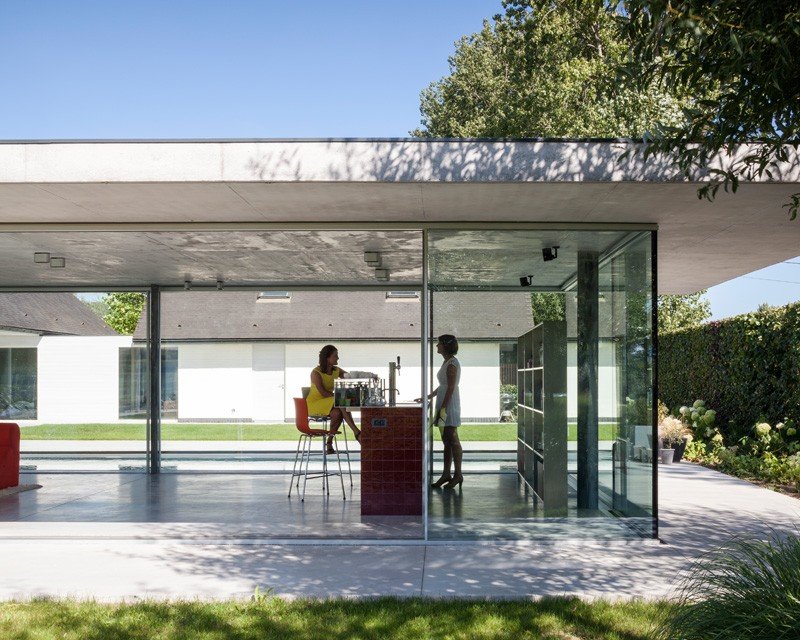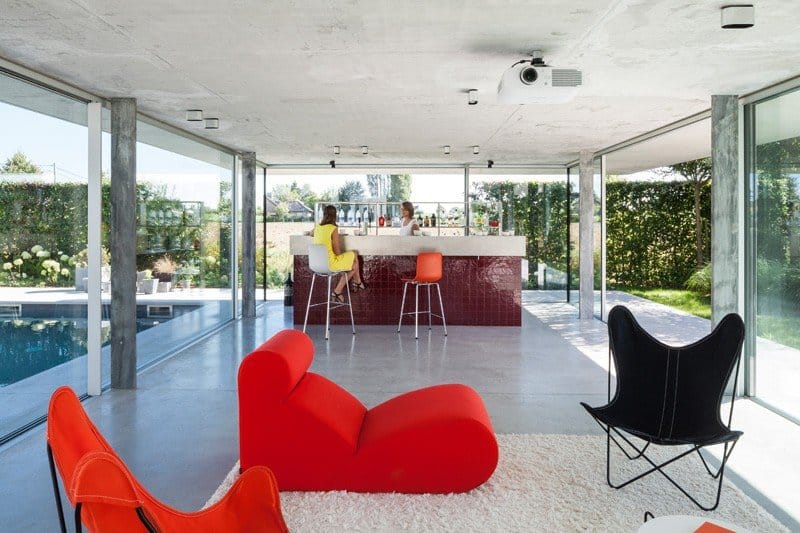 Description by Lieven Dejaeghere: The house is situated in Wannegem-Lede, Belgium, a very nice and cosy village at the entrance of the Flemish Ardennes, the scenery of the Tour of Flanders-cycling race. Its concerns an annex to an existing permanent residence, that serves a pool house, bar, home cinema and summer living room at the same time.