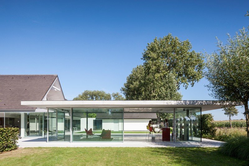 The transparent extension restructures the existing house and defines an inner area with the quality and characteristics of a farmstead and focuses on the garden, as well as the inner area and the surrounding landscape. The residence to expand has a specific architecture with a saddle roof. The extension separates itself as much as possible from the existing volume, and contrasts in simplicity and light structure.