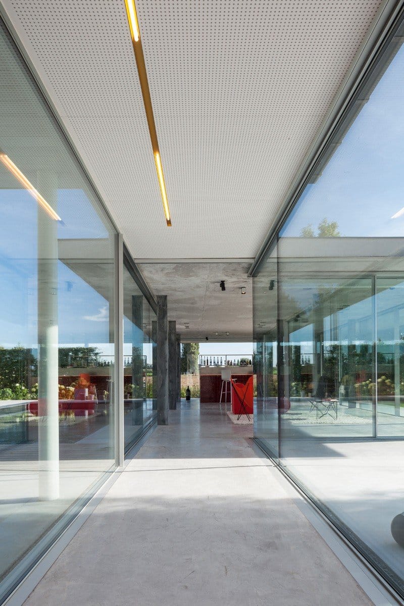 This project consisted in creating a pool house design that embraces the rural environment and furthermore includes the existing house from 1998 in its entirety. The pavilion, which was connected to the residence by using a glass footbridge, is completely enveloped in glass. The roof, in exposed concrete, contrasts with the fragility of the glass. The roof was cast on site with the aid of sight formwork and it is supported by steel fins.