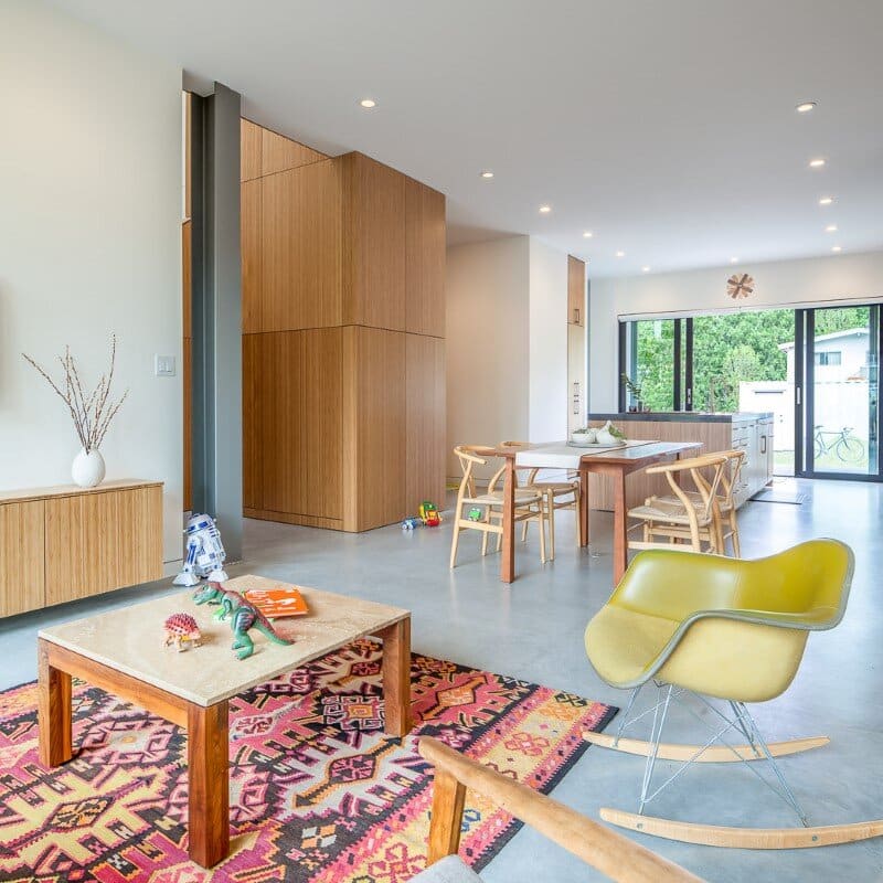 It was important to our clients, a landscape architect and physics professor, to optimize the grade relationship of the main floor living space with the garden. This desire, combined with the mandate to keep the building small, enabled an elegant solution. The slab-on-grade design that emerged from these considerations maximized the landscape opportunities of this 33′ x 120′ lot by keeping the main level finished floor just above the exterior grades and eliminated window wells. The plan was kept open and the form simple. Views available to the front and rear garden extend the sense of space far beyond the building’s envelope, providing the experience of generosity within the spaces while keeping the footprint small.