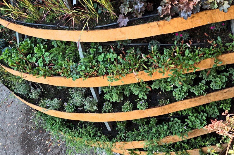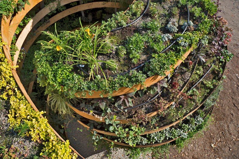 A skylight is located in the upper part of the structure providing the main source of light inside the structure during the day. Irrigation system is applied under each layer especially considering internal parts of a structure where shade plants are plated. Less dose of water is required by succulents and bigger quantity are needed by shade plants. Project is a part of a visual art program of European Capital of Culture Wroclaw 2016 and will be continued at least till fall 2017.