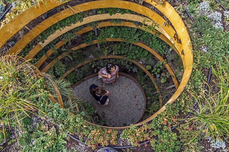 Description by Kalinowski: The Infinite Green is an example of a „green sculpture” which is a combination of steel and wood construction, soil and vegetating plants. Sculpture may remind graphic symbol of infinity especially observed from point of bird view perspective. Viewer has an access into interior of the structure. Additional aspect of the sculpture may be a color of plants: many shades of green color appear while different species are planted on 110 m2 on 7 shelves-levels of a sculpture. They also blossom in a different time of a year. Only perennials in quantity of 100 have been applied here.