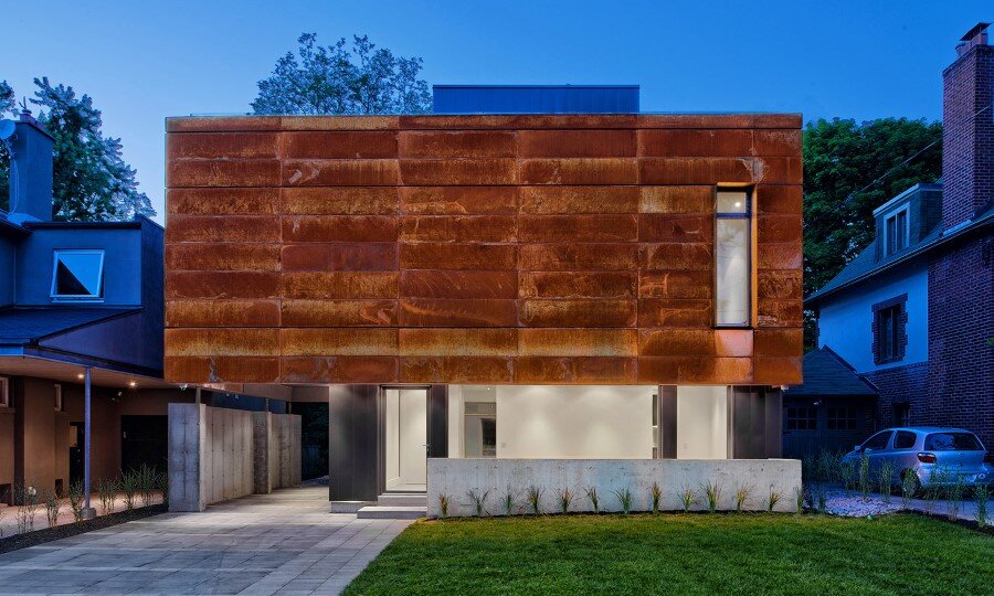 Expansive windows allow the owners to dwell amongst the ravine’s tree canopy while the lower family area spills into the shaded rear yard. The front dining area finds its comfort under the brow of the striking yet reserved Corten face. The dichotomy of the design responds to the contrasting public and private sides of the site; rooting it in its context while expressing the persona of the owners.