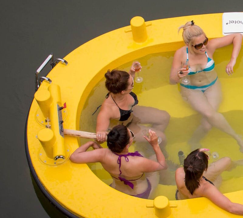 Frank’s long experience of wood stoves while living and working on his own barge helped him to develop a wood-burning underwater stove. This is what heats the 2000 liters of water in the HotTug to a pleasant 38 degrees Celsius (100 degrees F.) in a few hours. HotTug has been designed for several months now and it has had great success at Hiswa Boat Show in Amsterdam, in September. The designer is currently analyzing the possibility of achieving a serial production that will bring the nice motorized bath for rent on lakes and ports. The message is clear: It’s full steam ahead for the HotTug!