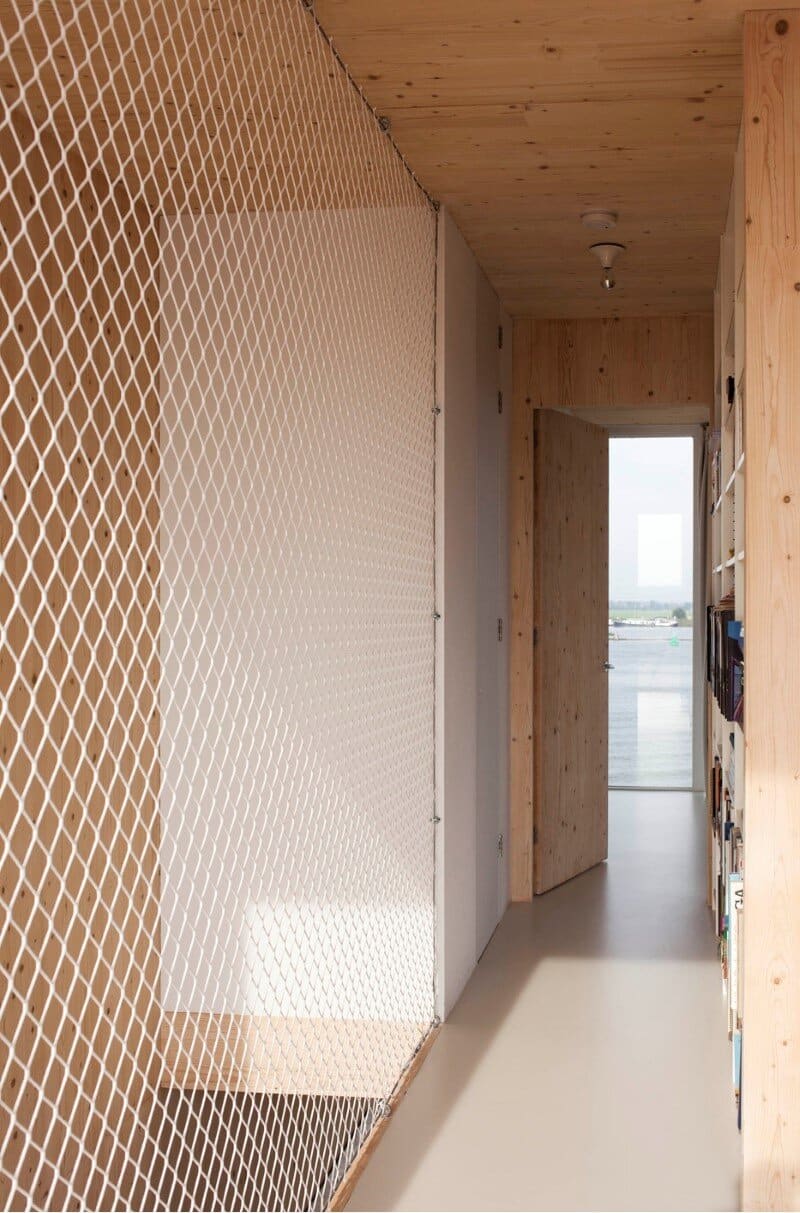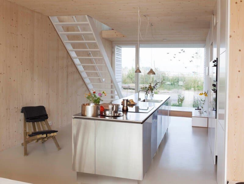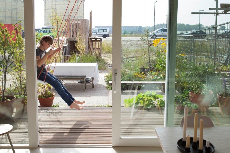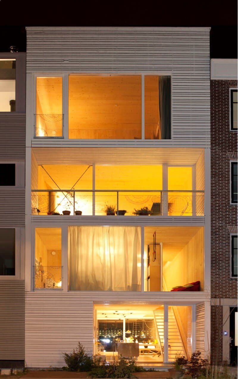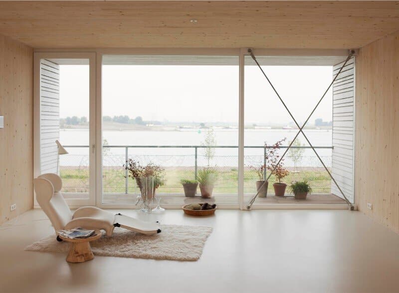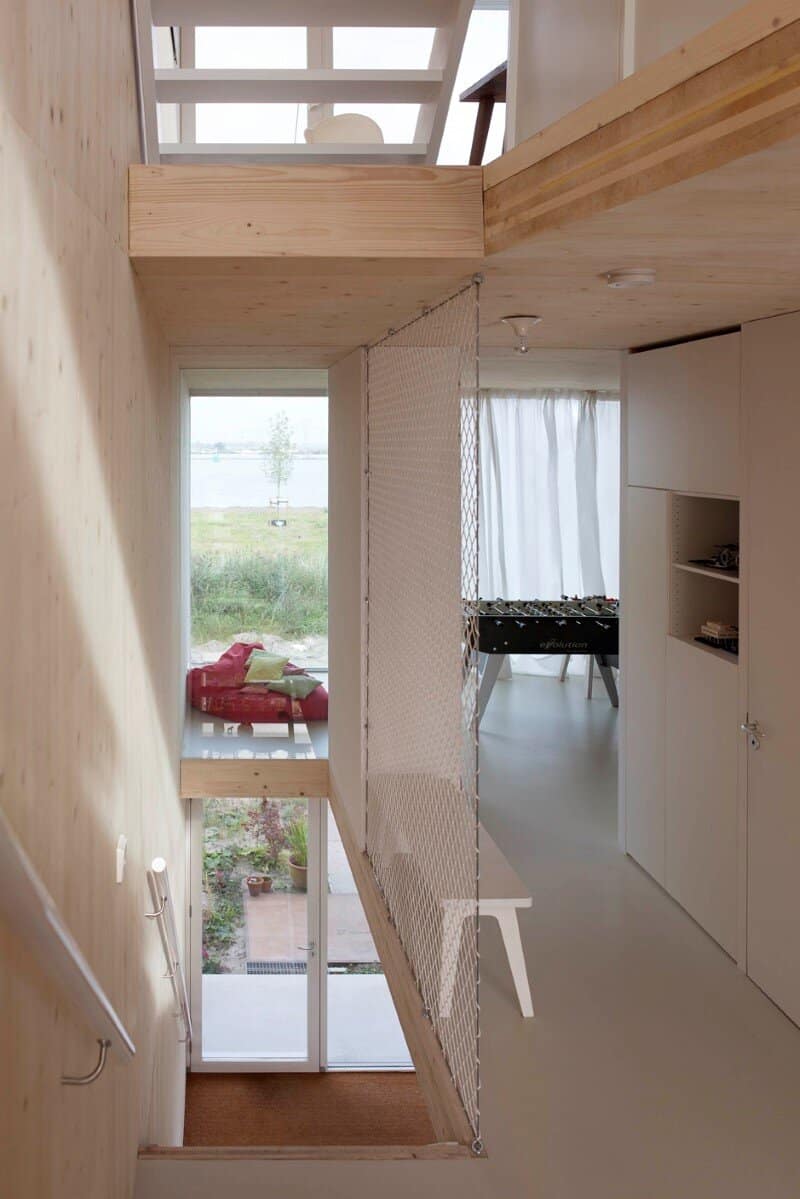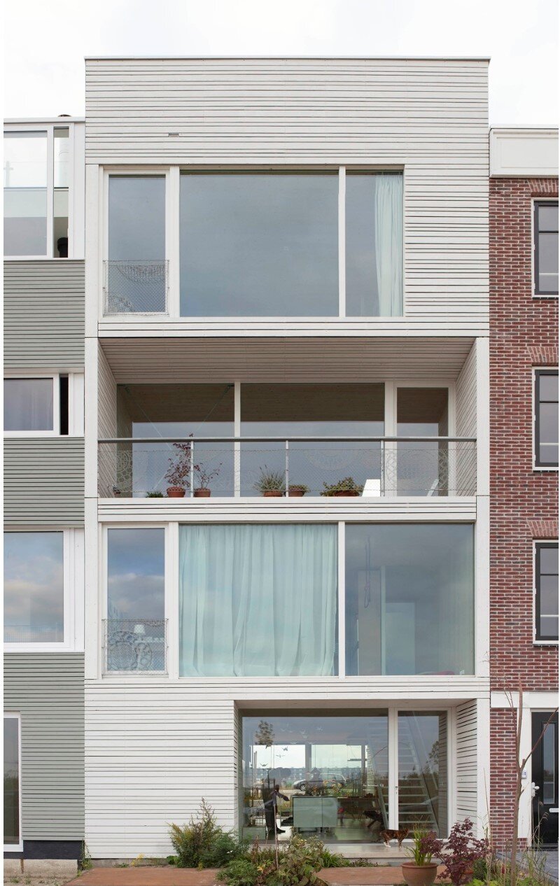 Description by Meesvisser: This transparent, daylight filled house is designed for a single family – two adults and two children – to live together in a comfortable, generous and open minded way. The house opens up on all levels: on the north side with magnificent view over the river IJ and on the south towards the garden. Every level has a wide balcony to create a green buffer to possible later developments on the south side.