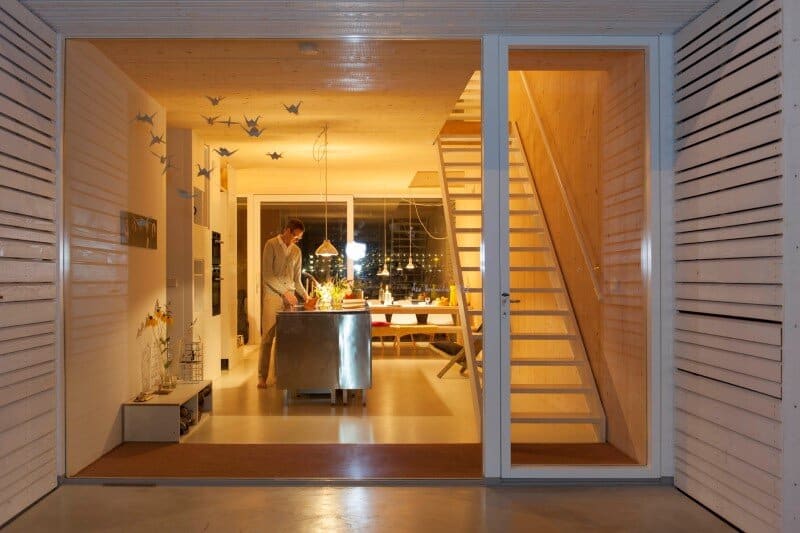 The whole construction was delivered in 2 days. All the wood panels were stacked in various groups around the building site, were numbered and protected against rain. During three weeks the main construction of the whole house was built. During the next four weeks window frames, stairs, balcony, etc were added. It took 4 more weeks for all interior finishes as flooring, kitchen, built-in furniture, etc.to be completed. With a limited budget and limited time, the whole project was built in a period of just 3 months.