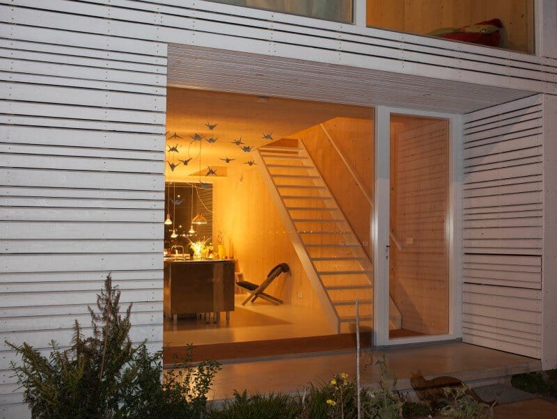 The house was completely constructed with massive wooden panels. All walls, floors and ceilings are prefabricated off site. Only the balcony and the stability construction on the second level are constructed in steel.