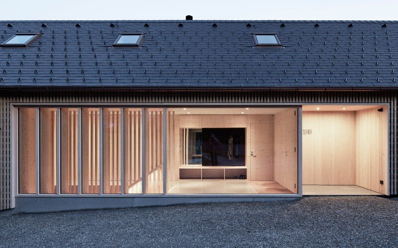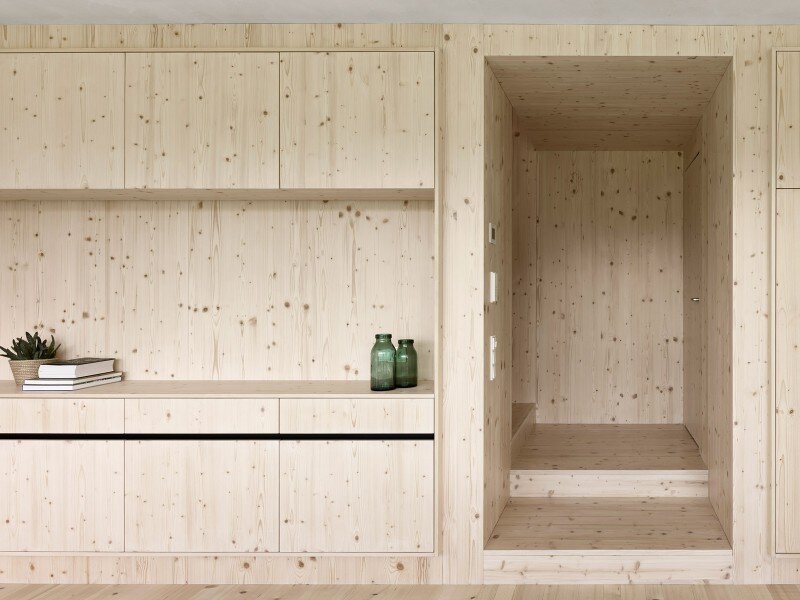 All furnishings and floors made from solid spruce, taken from the woods nearby, these elements alternate with hand-made plaster surfaces, produced on-site from light grey marble powder. Contrary to the spaciousness of the ground floor, the private retreats on the first floor are more densely organized, and a gallery-like extension to the roof, make the small rooms astonishingly generous.