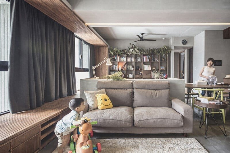 The heart of the Hsinchu Family Apartment is the living area, which also serves as the entryway. This is the largest room in the apartment and is designed to be multifunctional. It features a comfortable seating area, a dining table, a small office space, and a compact library. The living area’s open plan promotes family interaction and flexibility, making it a central hub for daily activities.
