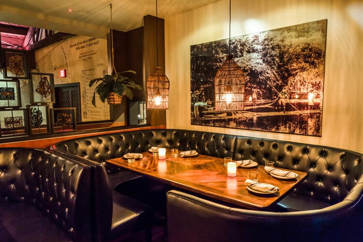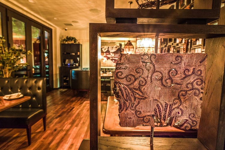 The front of house is a mix of hand painted murals and native crafted Indonesian artifacts and custom woodworking. All of it framed in a contemporary manner to display the intricacies and details that are represented in that culture. Most beautiful are the antique bronze Tjaps, which are normally used in hand-stamping the detailed and colorful Batiks that make up the beautiful textiles from that area of the world. Other specialty design elements include Hand Printed Mirrors and Back Printed Resin Panels depicting 1930’s Indonesian jungle expeditions.