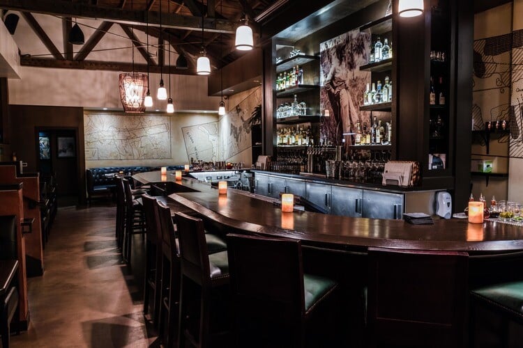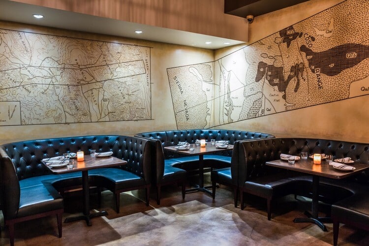 The hand painted desert survey mural in the bar area is indicative of Mr. Hopper’s collegiate years, when he mapped the Mojave Desert. 300 gorgeous antique brass Batik stamps, called Tjaps, are individually framed around the upper dining areaand fish trap lamps filter warm light through their intricate designs. These are representative of his expeditions through Jakarta and 36 islands in Indonesia. The Post-Colonial private dining room envisions the reflections of those travels within cozy brick walls, rich wood details, a fireplace and custom shelving to display his collected artifacts. Deep-set leather booths (there are no chairs), heavy wood, and dim lighting round out the vibe—anywhere you sit at Hutchinson’s oozes sex appeal. It has a quintessential date night vibe, but the bar area, which is slightly more casual and in a separate, sunken-in section, also makes it a great spot for a business meeting.