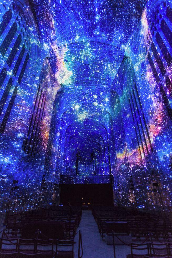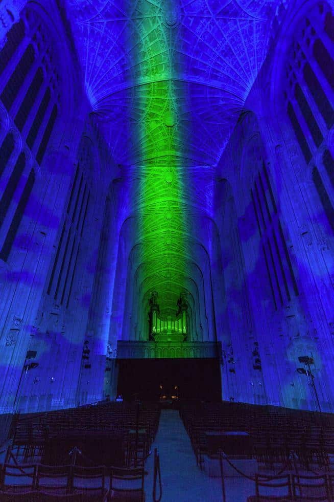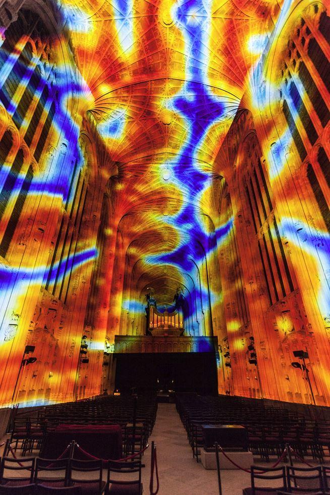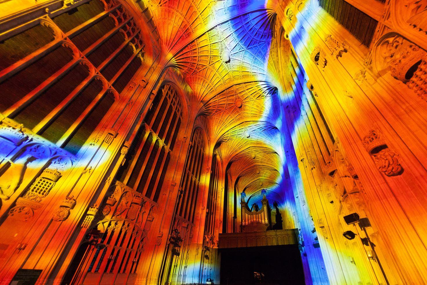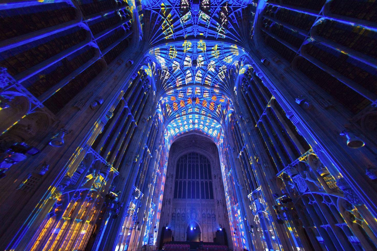 The site-specific installation highlights the architecture of the 16th century Chapel through light and highlights the high technicality of the cathedral’s fan vaults, one of the finest examples of late Perpendicular Gothic English architecture. The soft light and the wealth of colours from the digital installation is in resonance also with the light from the stained glass windows. The installation gives the building life before our eyes, creating an unprecedented visual experience.