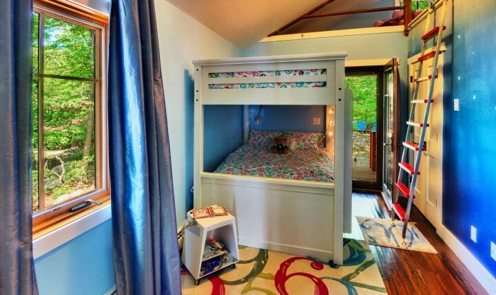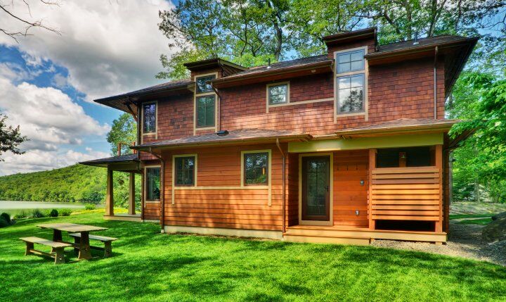 The private bedroom level is cantilevered throughout to increase habitable floor area. The floor extension contributes to overall depth, detail, form and massing while maintaining the strictly limited allowable footprint at ground level. Outside the bedroom level, deeply bracketed eaves provide shading from the summer sun and shelter from the elements above the southern roof deck which hovers above the lake. Visit Hudson Design