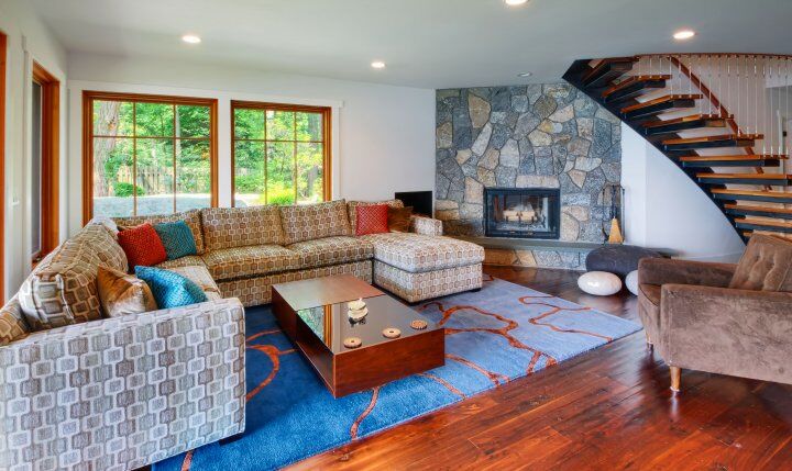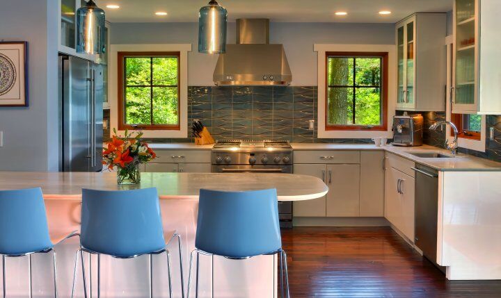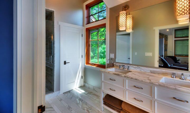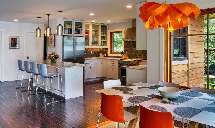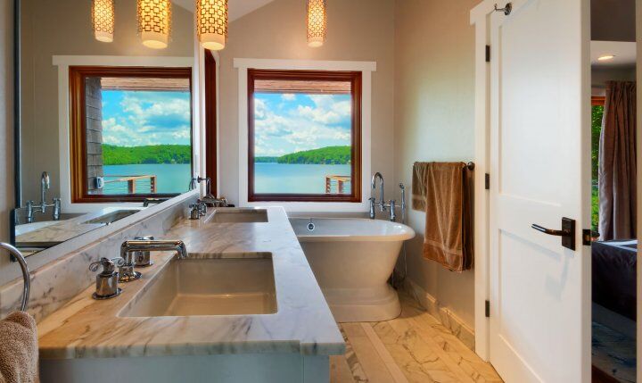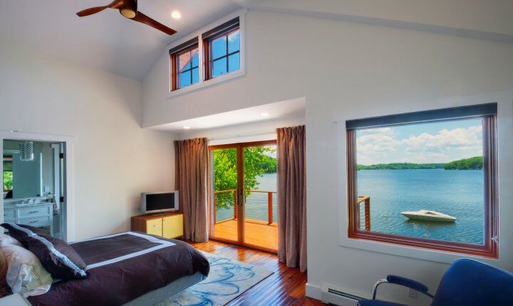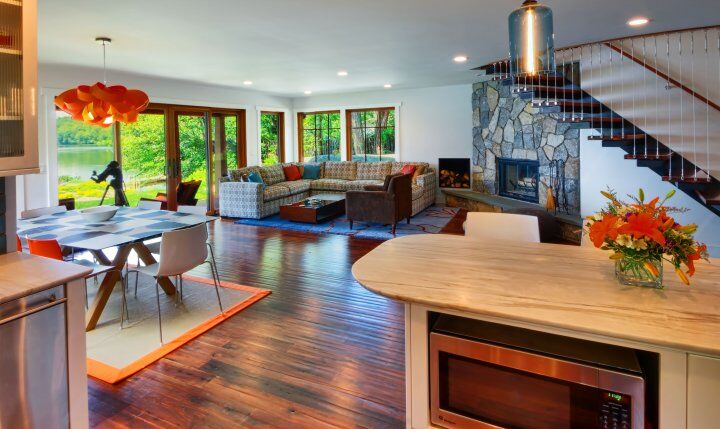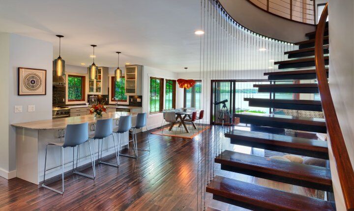 Beyond the curving stair lies a wide framed panoramic view of the lake from the open first floor living area. An expanse of glazing on the lakeside blurs the distinction between interior and exterior space leading the eyes to the cantilevered dock and inviting lake where this family of six enjoys swimming, boating, kayaking, waterskiing as well as ice skating in the winter.