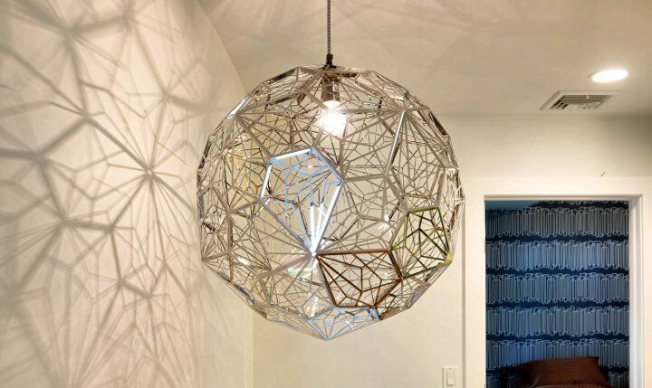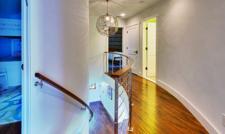 An open living plan is accompanied by a cantilevered curving stairway which frames spectacular panoramic views of the lake and southern shoreline beyond. The centrally located stairway, constructed primarily of steel, walnut and stainless steel cable, serves as the interior focal point and backbone of the home.