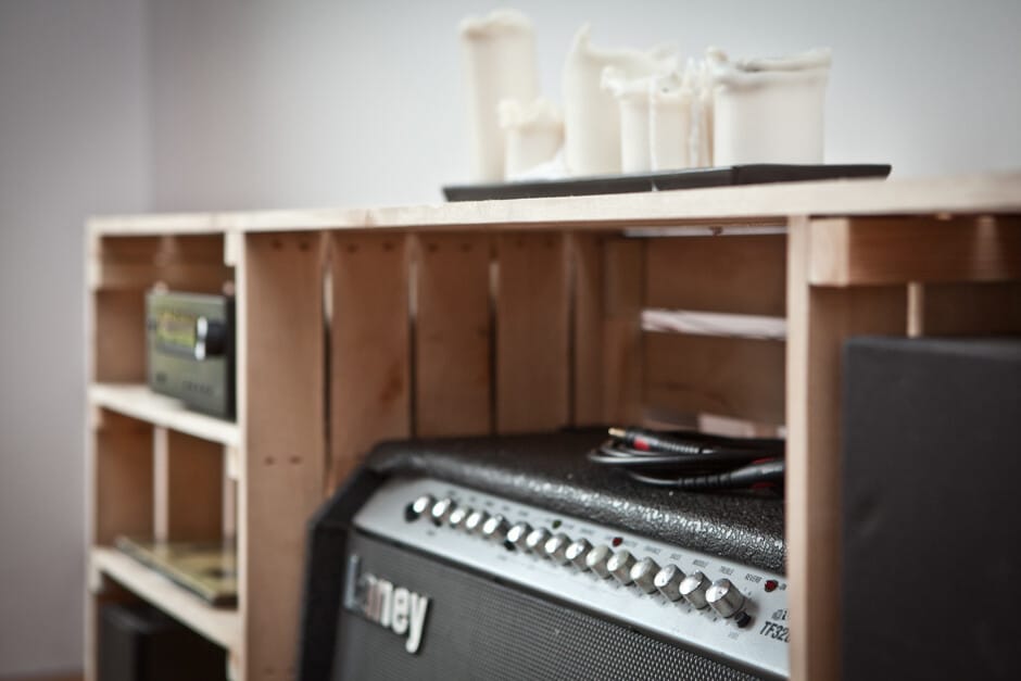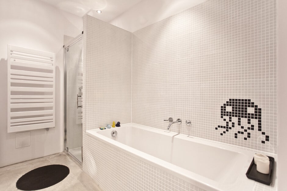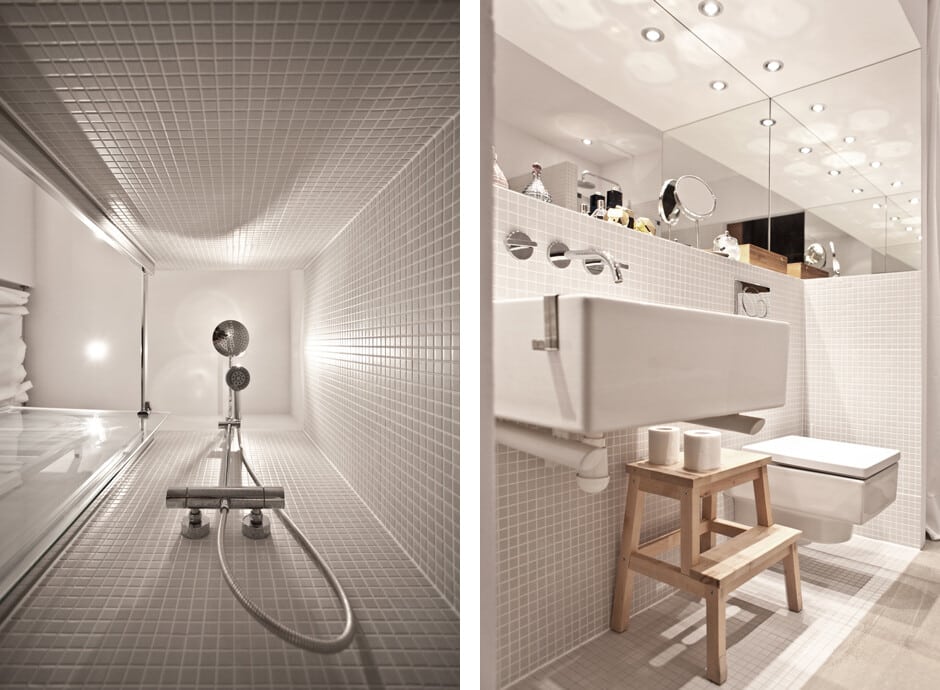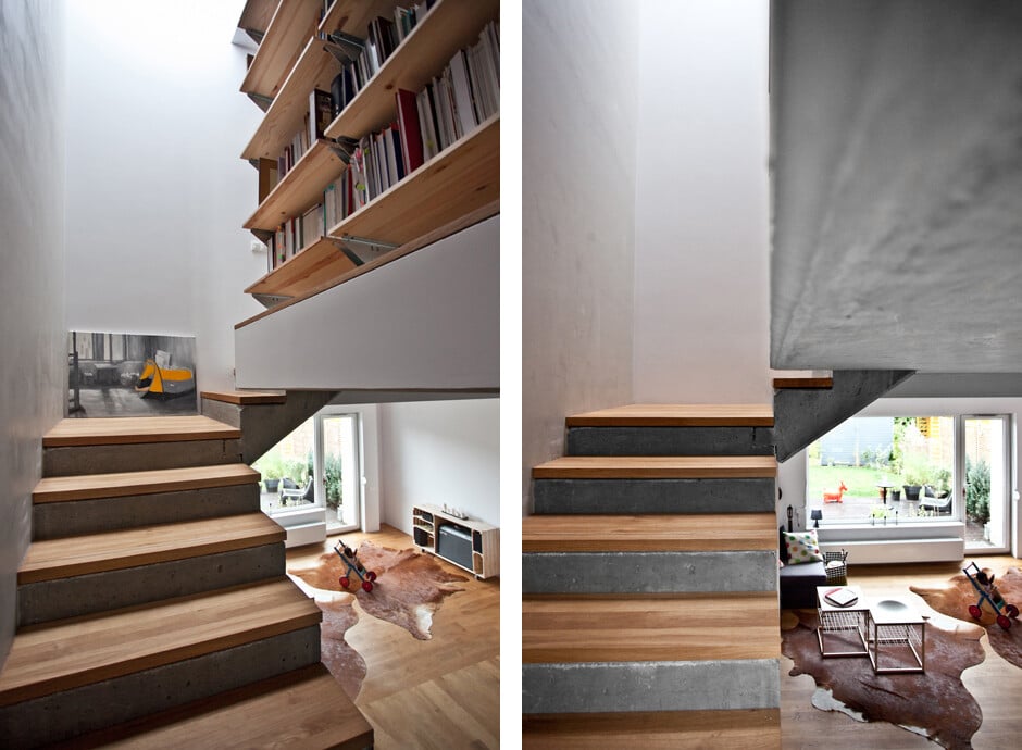 The architects’ recipe to create an open and comfortable space was to organize zones with different functions, relying on the natural materials for the homely atmosphere. Cow’s hide (leather) and wood can be encountered in various combinations, on the floor or walls. The plank is used to make shelves inclusively the library fixed on the ladder. On the ground floor, the presence of a fireplace can be observed that contributes to the achievement of an attractive home. It seems that, without the need for an exaggerated budget, the wood “does his duty again” and decisively contributes to the transformation of a cold concrete structure, into a warm and welcoming home for a young family.
