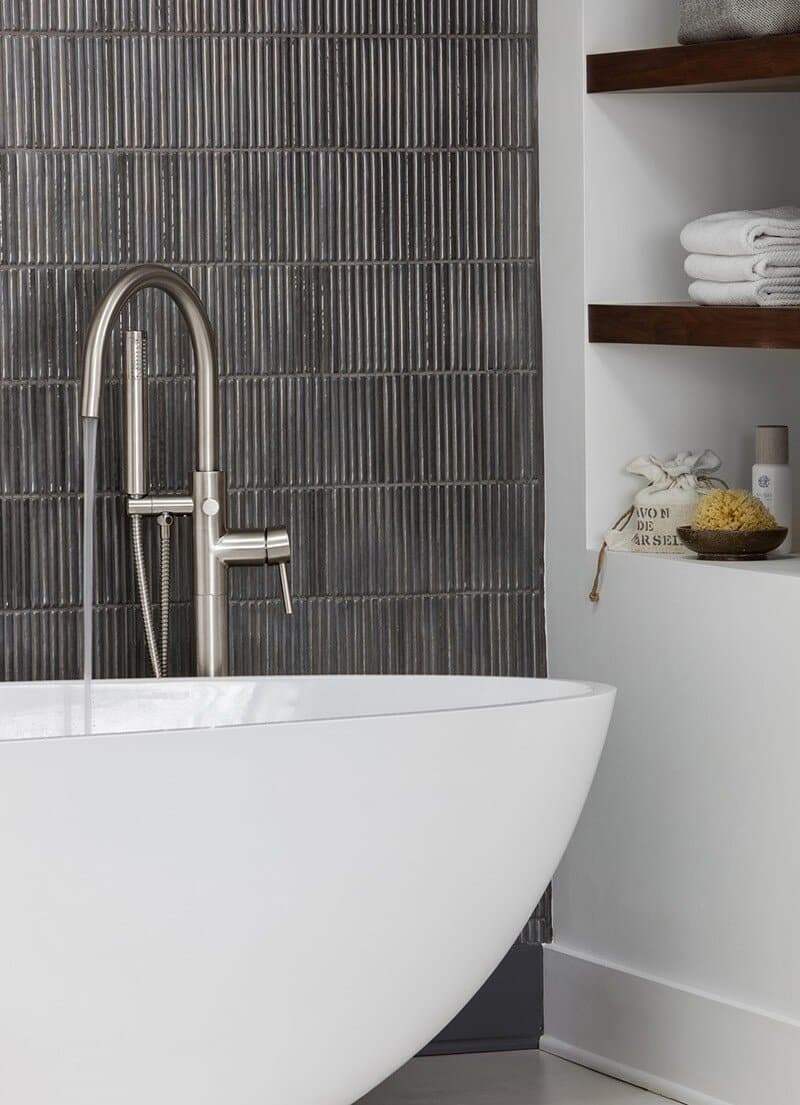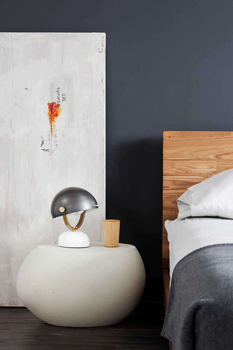 The deep charcoal wall in the bedroom provides dramatic contrast to the teak headboard and hammered silver light fixture. The ensuite’s feature wall is made of pewter ceramic tiles that add texture and elegance to this simple space. Materials and furnishings throughout were selected for their simplicity and form.